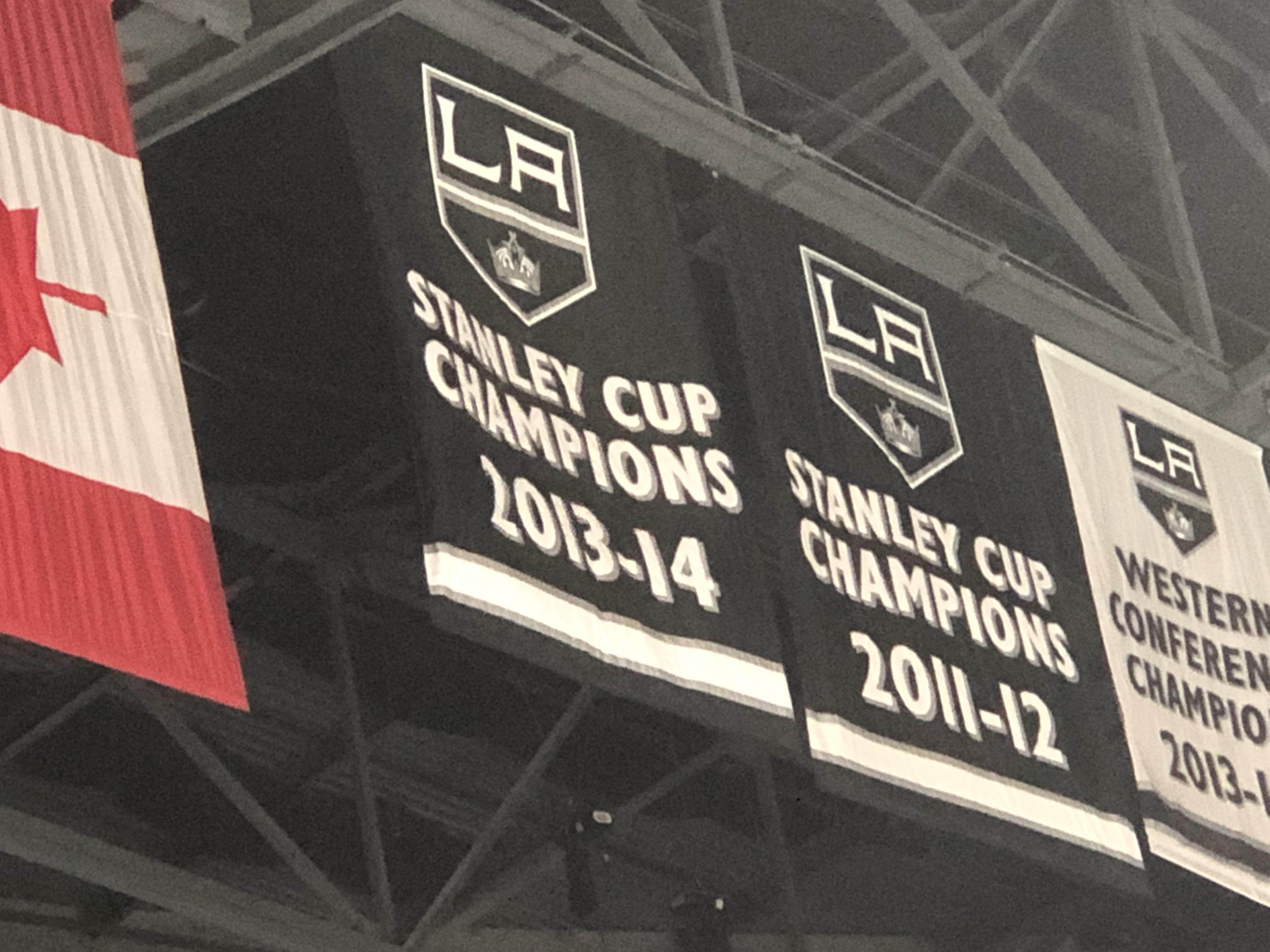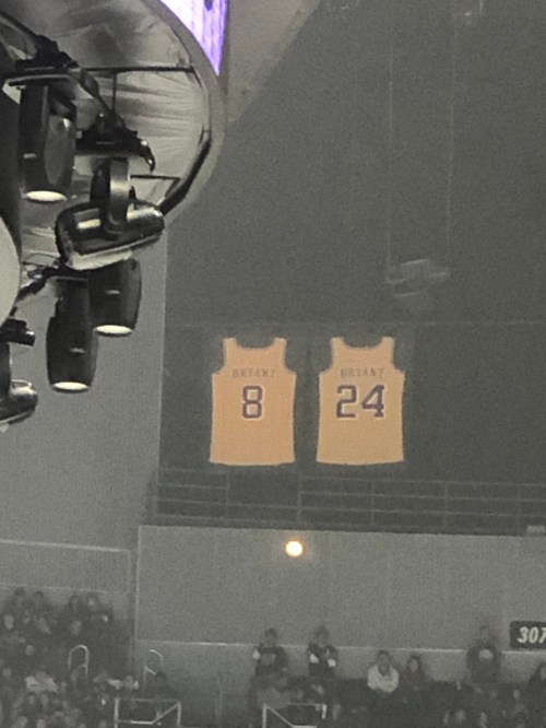 Look up there, way up in the rafters, just to the right of the bottom of the scoreboard…