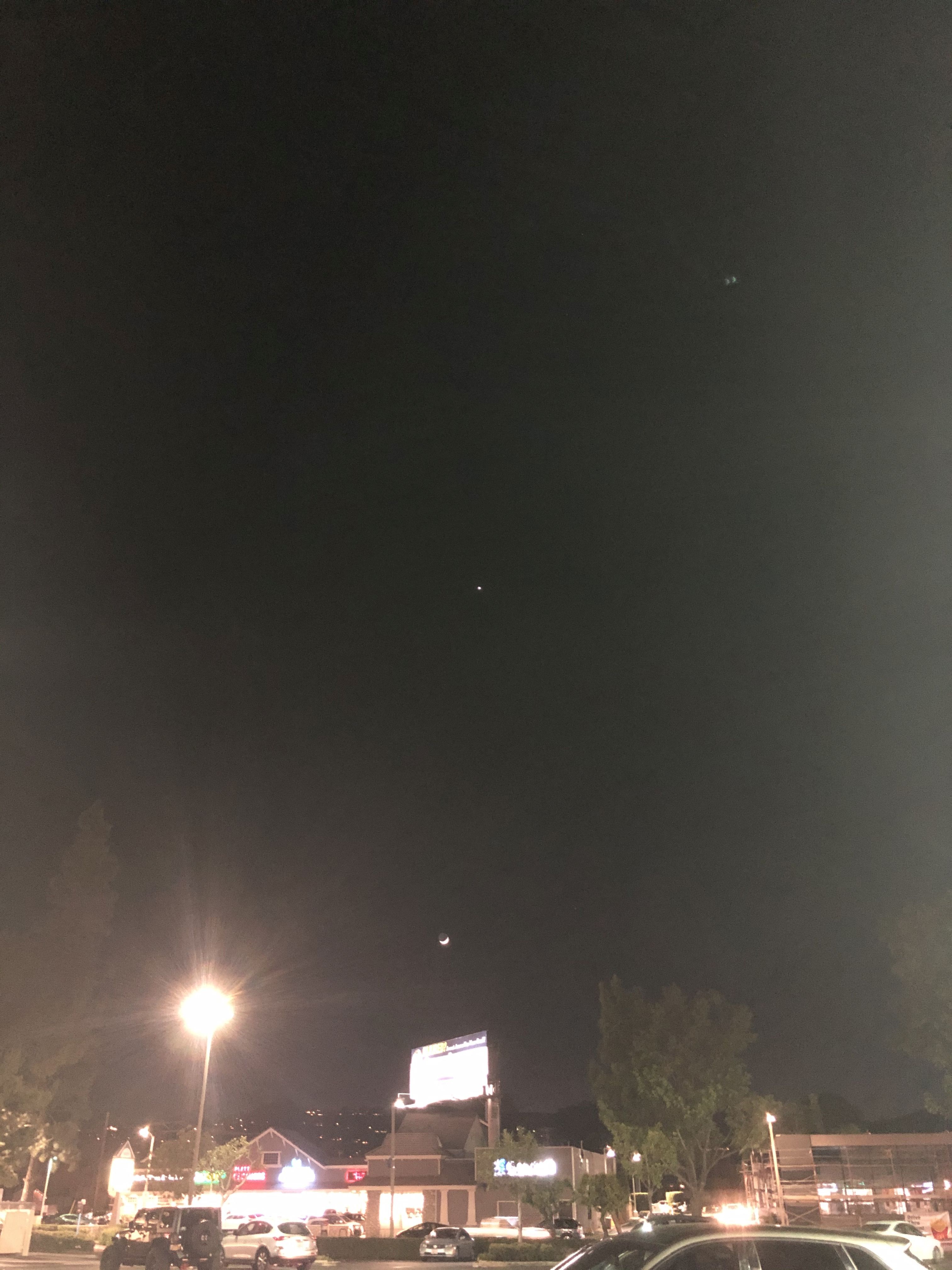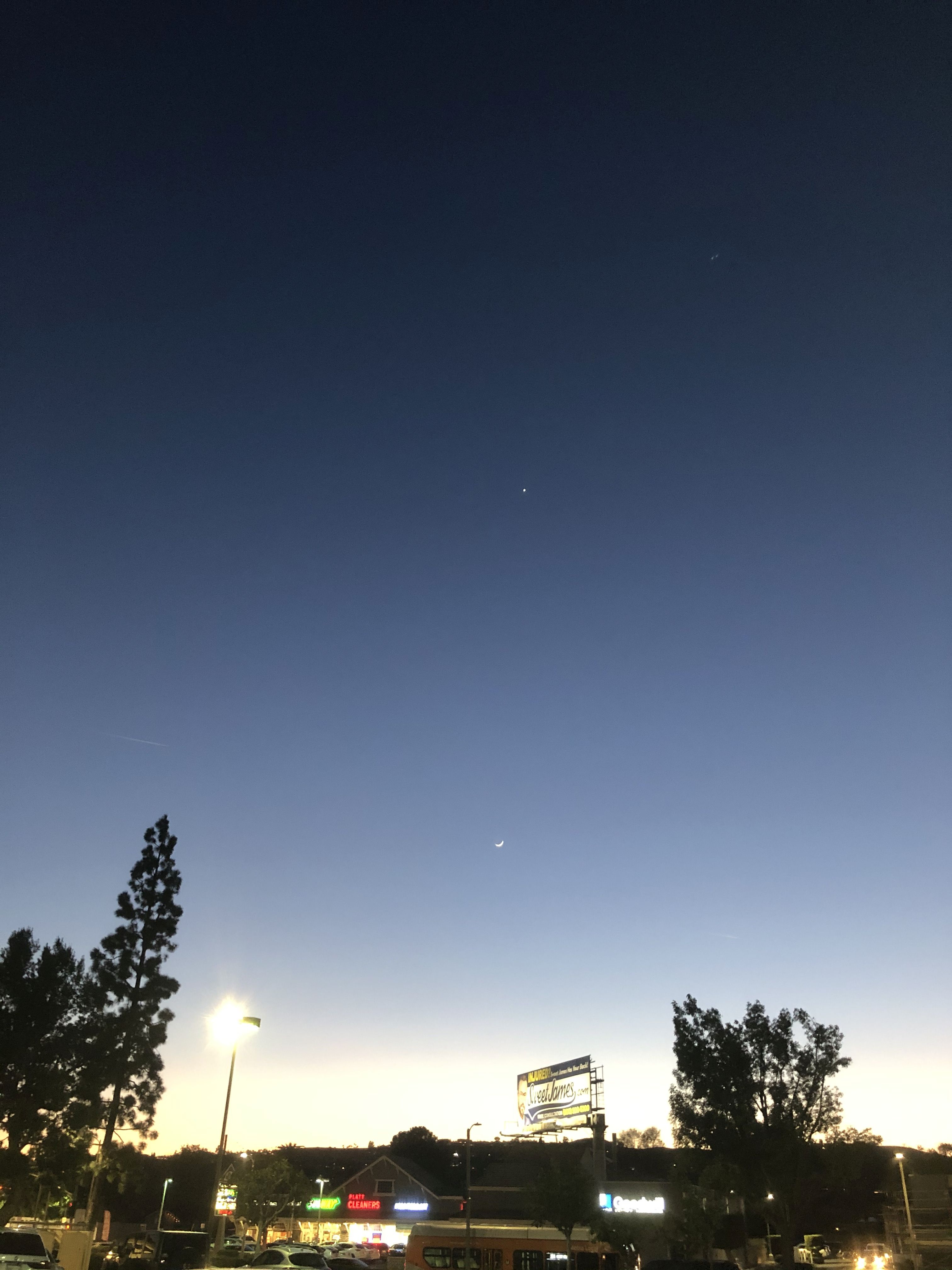 About forty minutes later, after I had gotten my haircut, it was fully dark, but the moon was still above the hills and billboards. If you zoom in, even with this cheezy iPhone picture (which, let’s admit, has a pretty amazing camera in it as much as I might make jest), you can see the outline of the almost New Moon illuminated by Earthshine.