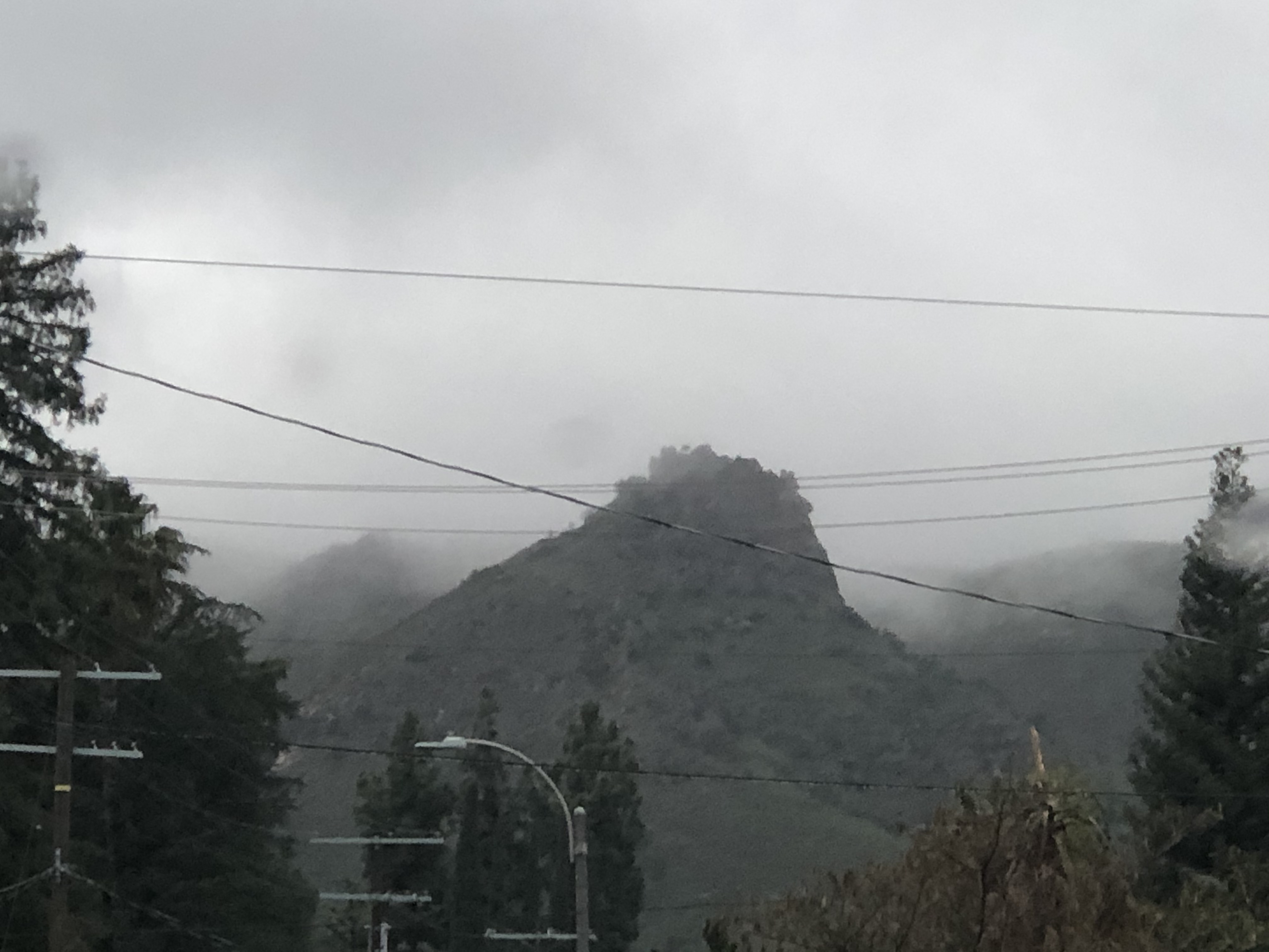 You’ve seen it on fire from our front yard, and in any number of evening sunset and ISS pass photos as well. This picture shows it wreathed in low hanging clouds. The perspective’s different because it’s taken on the street down on the flatland at the bottom of our hill.