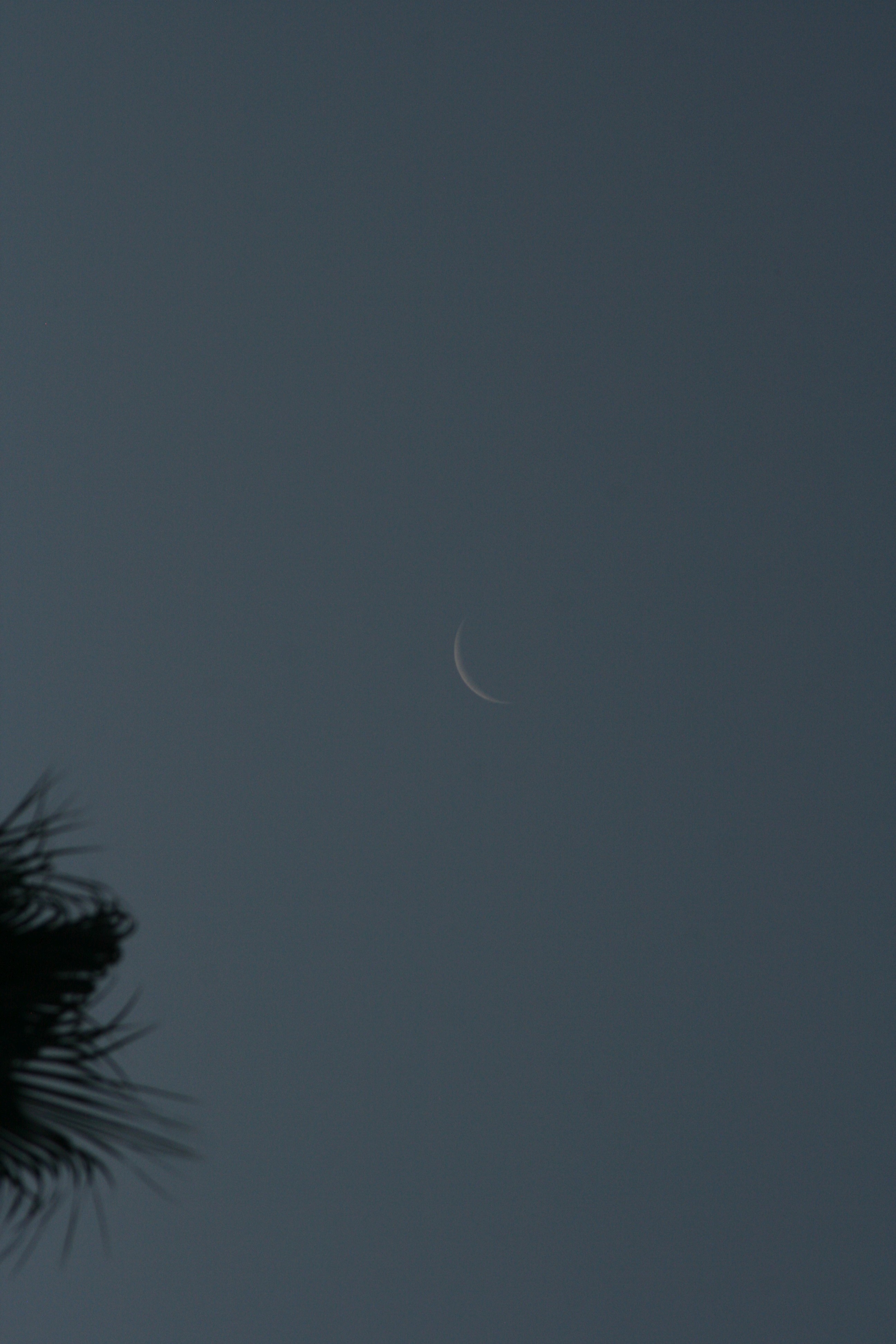 To the left of the moon (on the left side of that palm tree) is Aldebaran. Once it gets a little bit more dark, you should be able to easily spot the Pleiades. (Remember?)