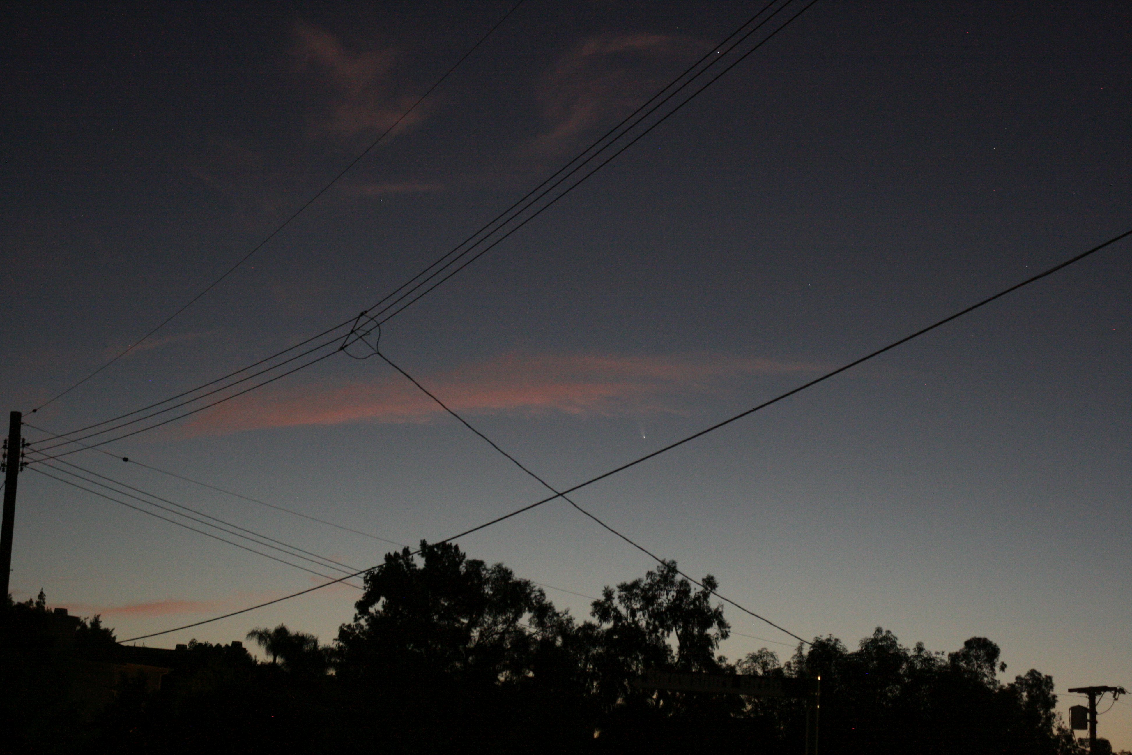 Knowing that, I had checked out a spot in the back yard which has a clear view in that direction, but also has an 8′ tall hedge between our yard and the neighbors’. Not good – the comet’s going to be low. So I went out in front and found a spot at the bottom of our driveway and another across the street where the view was clear, except for one of the aptly named “hills” in “West Hills.” But we’re on top of another one, so I was hoping I would get lucky.