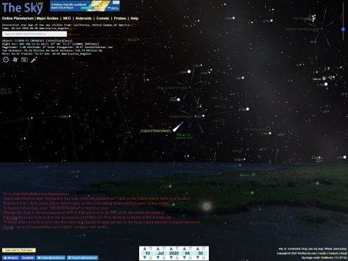 First of all, if you want to see where to look for it yourself, there’s a free planetarium site online called TheSkyLive. Here’s a quick tutorial I did to walk you through setting it up for your location, looking for this comet in particular, and then bringing up the clock controls so that you can see where the comet will be on any given day or time.