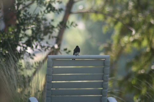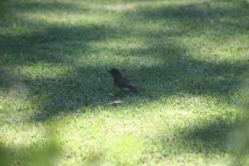 Sometimes on the ground, often on that chair (a lot of birds are liking that spot), sometimes in the tree.