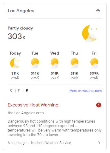 I was surprised today to notice that on the Google News page, not only can you get the local five-day weather forecast in Fahrenheit and Celsius, but also in Kelvin.
