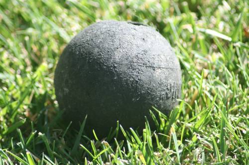 It’s bigger than a baseball, but smaller than a softball. It’s very hard rubber or some kind of synthetic material. There’s a hole going through it, and there was something plugging the hole in the center.