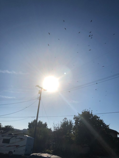 If a large group of crows is a “murder,” this must be a mass murder. There at least 42 of them here (that is the answer, after all) and it was hard to keep track as they were all wheeling about, some joining and leaving all the time.