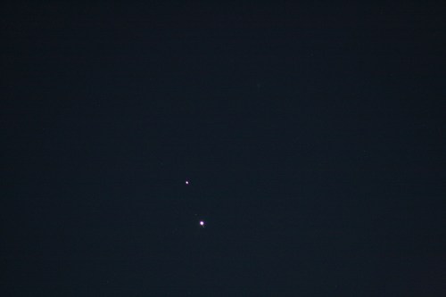 Click on it to see it full sized! Saturn is the dimmer one above, Jupiter the brighter one below, along with some of the Galilean moons. It looks like Callisto a ways away from Jupiter at the eleven o’clock position, with Ganymede close to the planet at four o’clock and Europa further away. Very, very close to Jupiter, lost in the glare inside of Ganymede is Io.