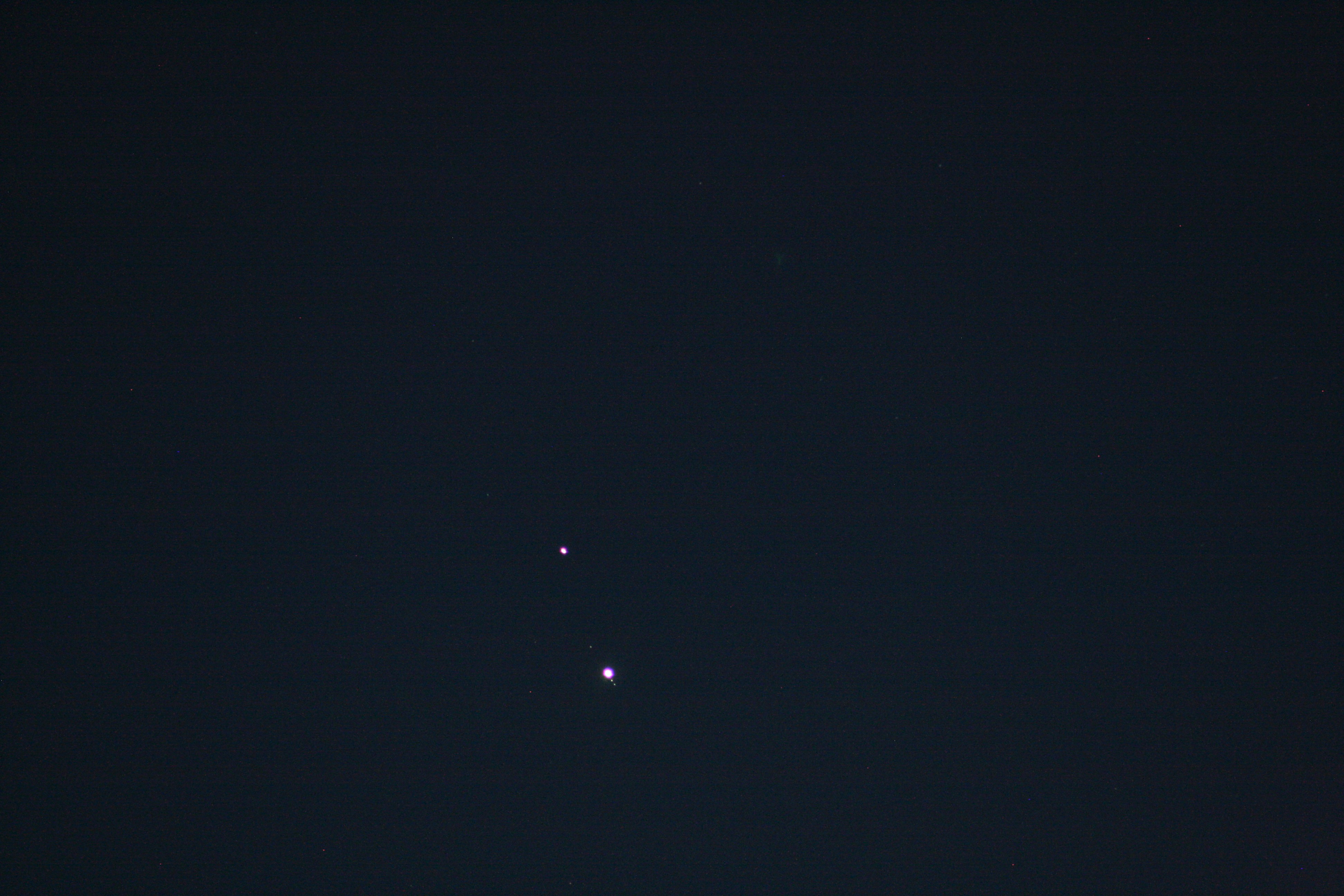 Click on it to see it full sized! Saturn is the dimmer one above, Jupiter the brighter one below, along with some of the Galilean moons. It looks like Callisto a ways away from Jupiter at the eleven o’clock position, with Ganymede close to the planet at four o’clock and Europa further away. Very, very close to Jupiter, lost in the glare inside of Ganymede is Io.