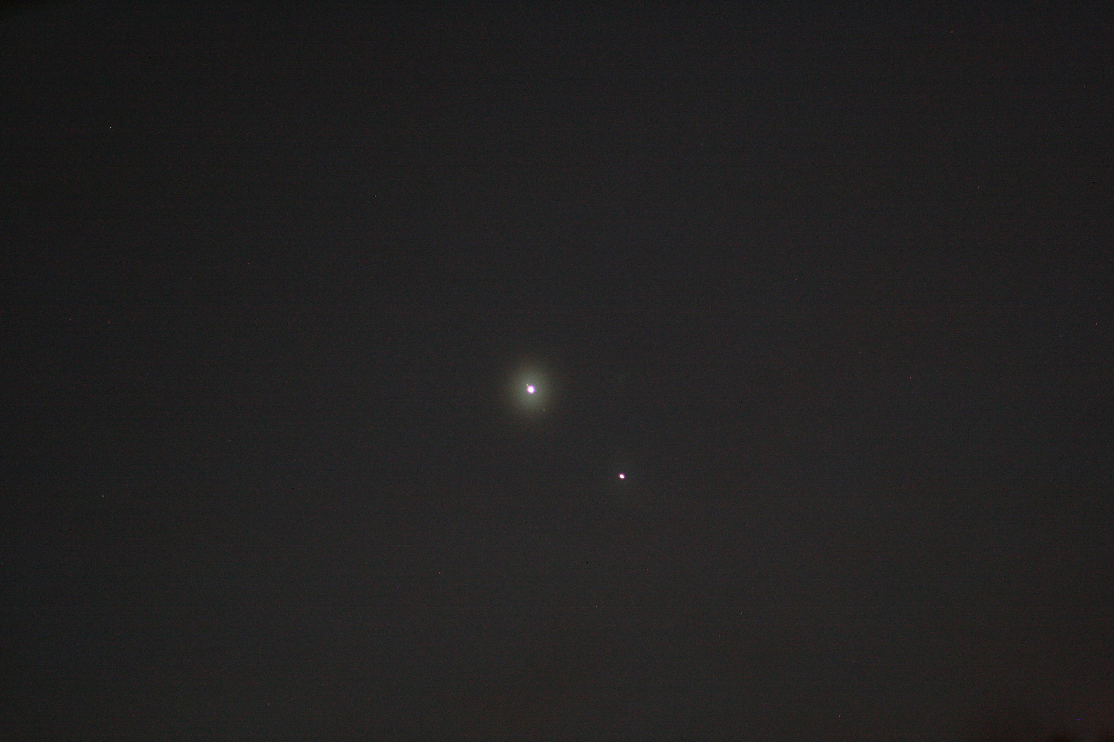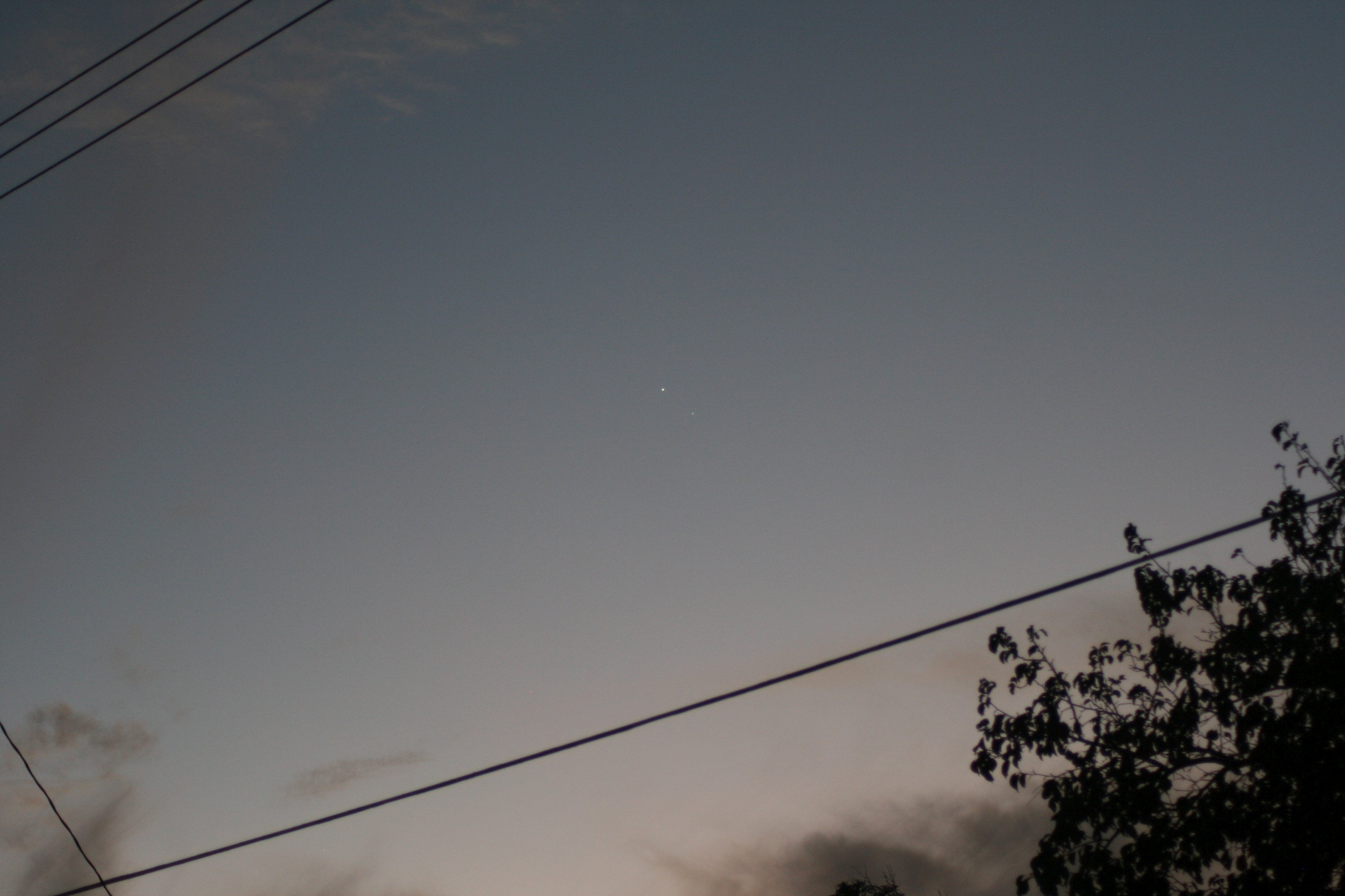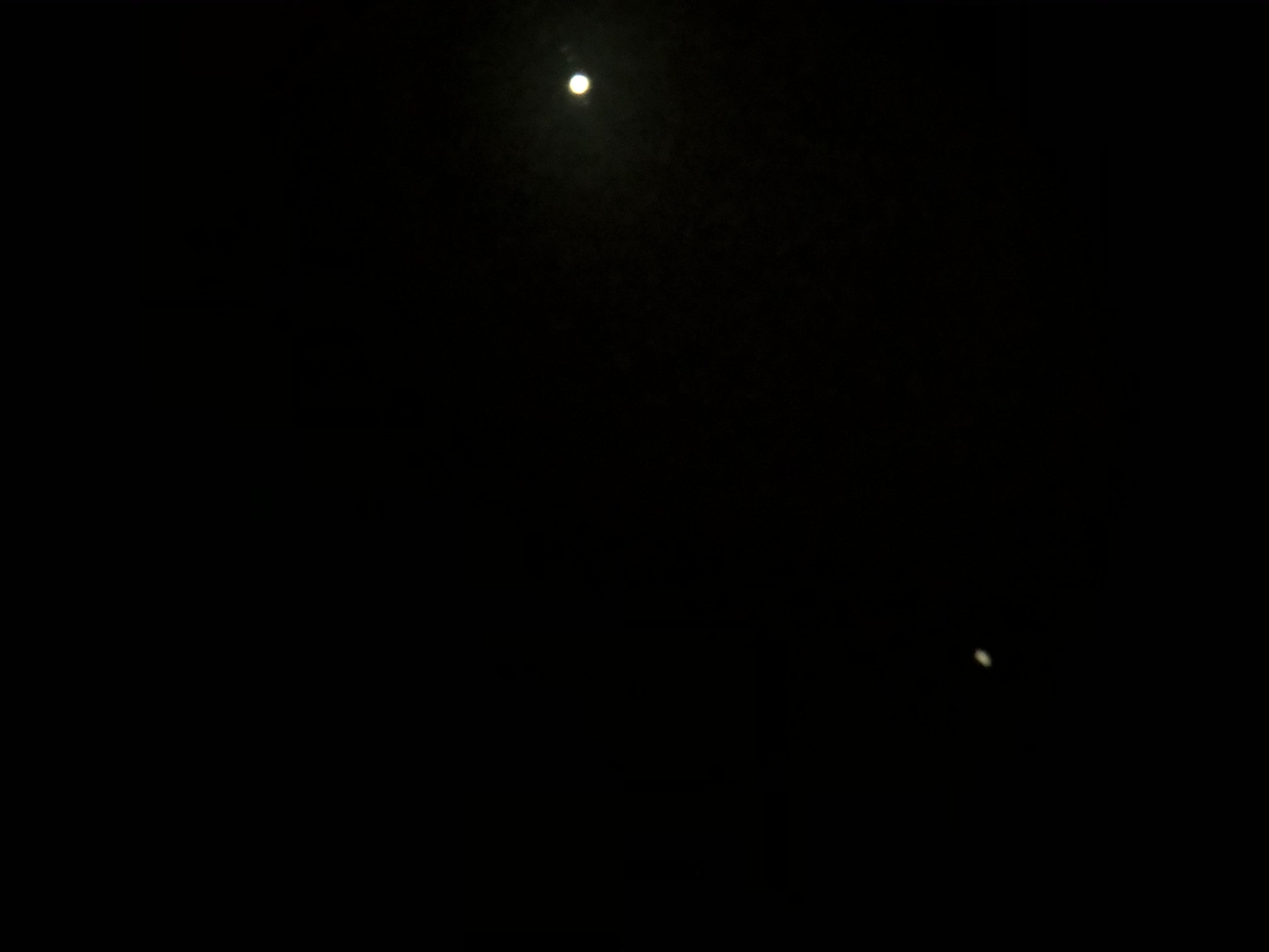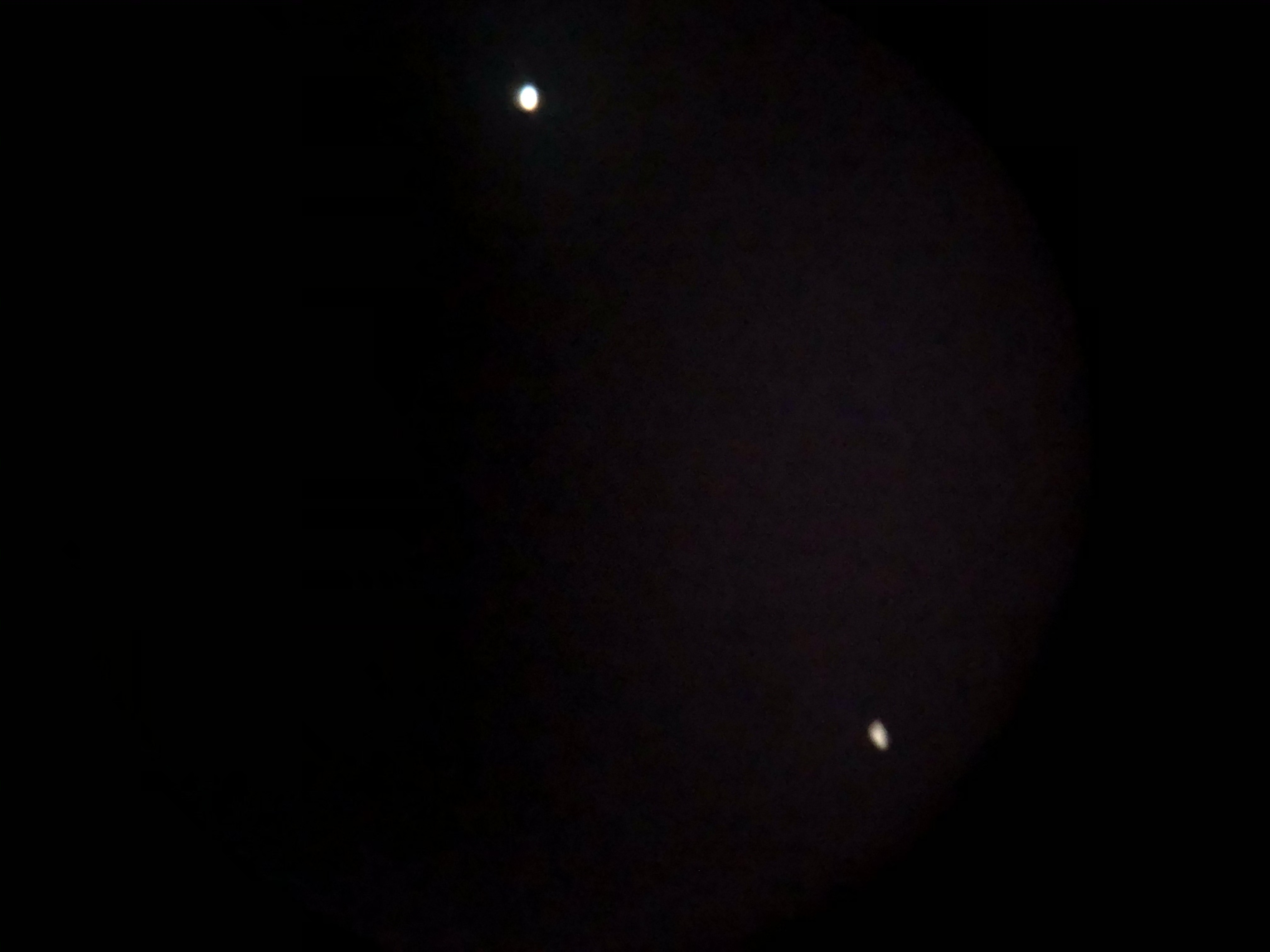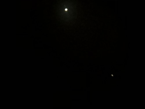 Shoot enough pictures fast enough and you might get lucky – this was the best for tonight. Saturn’s definitely elongated, almost sorta-ish able to see the rings (which were clearly visible through the eyepiece to the naked eye) and through the haze, you can also almost sorta-ish see three of Jupiter’s moons.