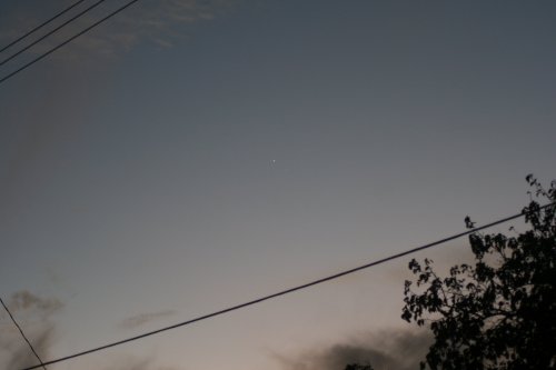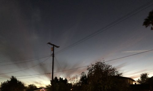 Very pretty, but if you’re familiar with the pictures from the last several weeks, right in between those two sets of wires and right above that biggest tree – and right behind those clouds! – is where Jupiter and Saturn are.