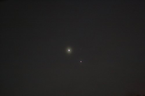 Patience paid off, sort of. Not excellent, but given the conditions, acceptable. You can see that Saturn is now below Jupiter, closer to the Sun, after starting a couple weeks ago up above it.