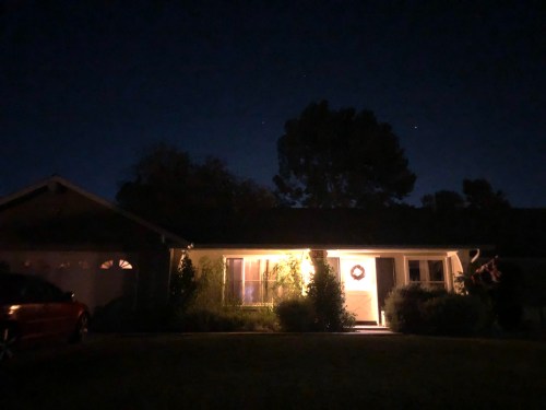 And so, at the end of the day (literally) we’re left with just the porch and garage lights and Orion rising, partially hidden by that giant tree in the back yard.
