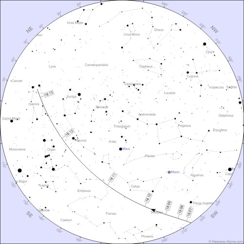 Rise in the southwest, well after sunset, nice and high and bright, right past the shoulder of Orion, fade to yellow-orange-red-dark as the ISS goes into night right next to Castor and Pollux in Gemini.