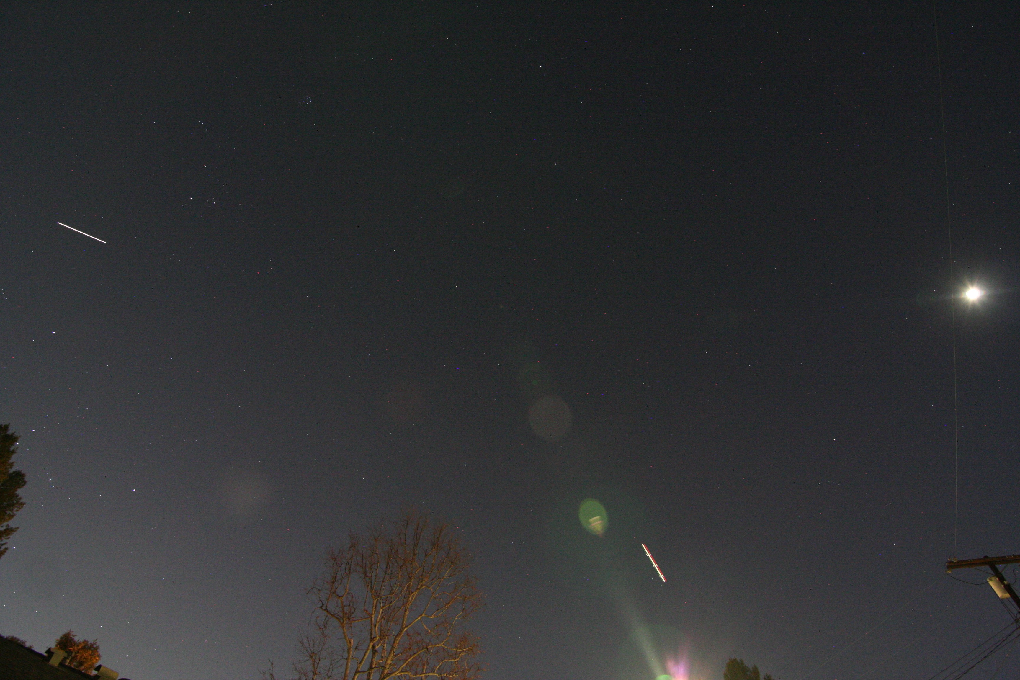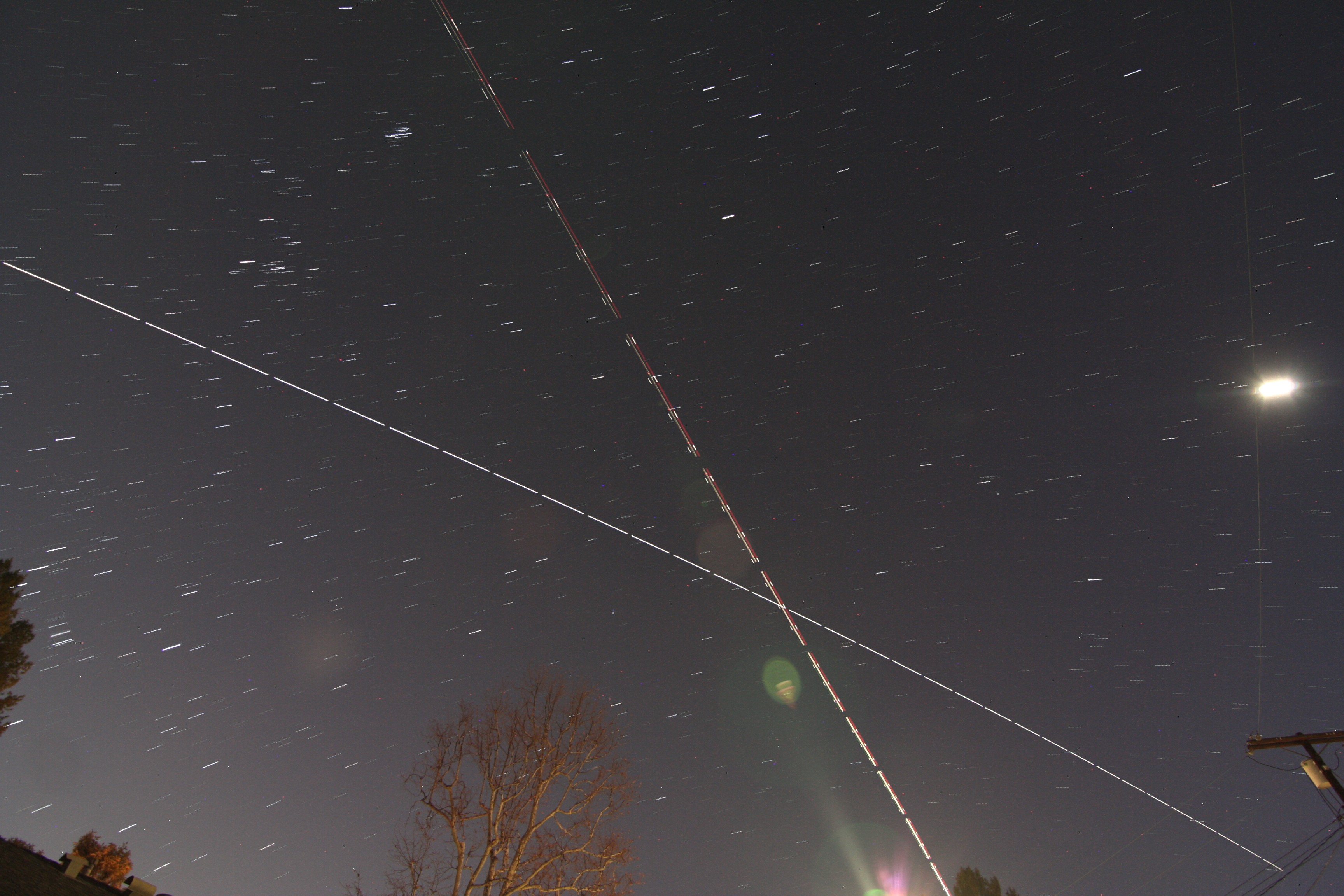 There’s the ISS coming from the lower right to the upper left, and that outbound LAX jet coming from bottom to top. The moon and stars are all trailing since they got picked up on every single image over the course of three minutes and fifteen seconds and the planet was rotating. But LOOK AT HOW SHARP THOSE STAR TRAILS ARE!!