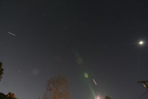 Here’s one 5-second exposure from the sequence. The ISS is that streak departing the frame at the upper left after having entered right by the telephone pole in the lower right. The bright white light in the middle right is the moon. Just below the center right of the picture is the idiot streetlight, along with all of the lens flares coming up from it. And just above the light is a streak from a jet coming out of LAX.
