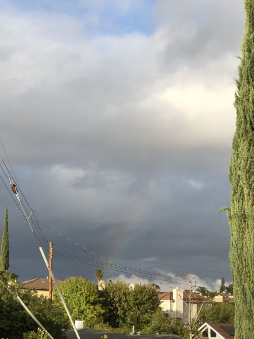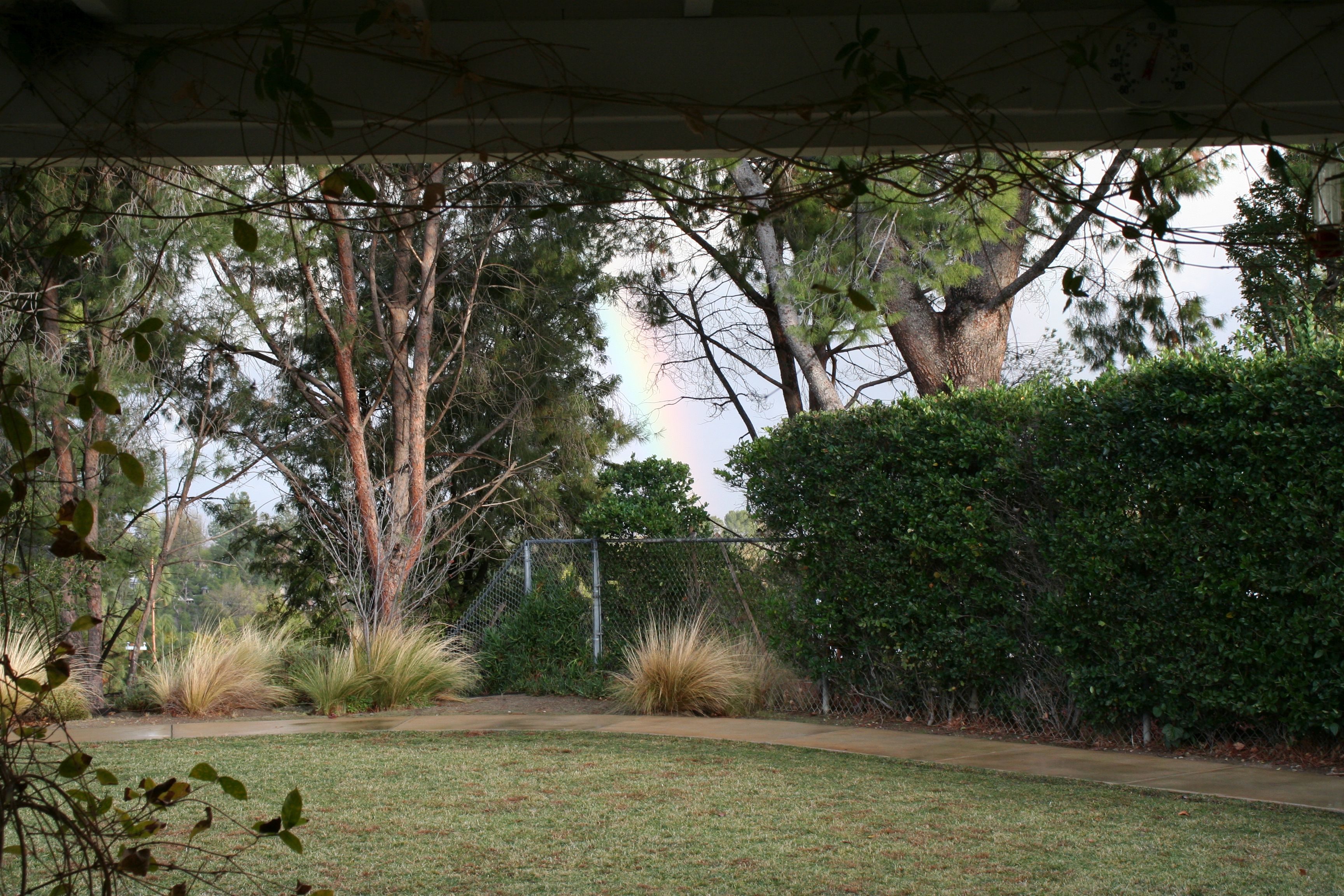Well…okay. Sort of weak, off to the north, but those white, low clouds just above the rooftops lend atmosphere? Maybe today’s not the day for rainbows after all. So I went into the house and looked out the back doors to the east…
