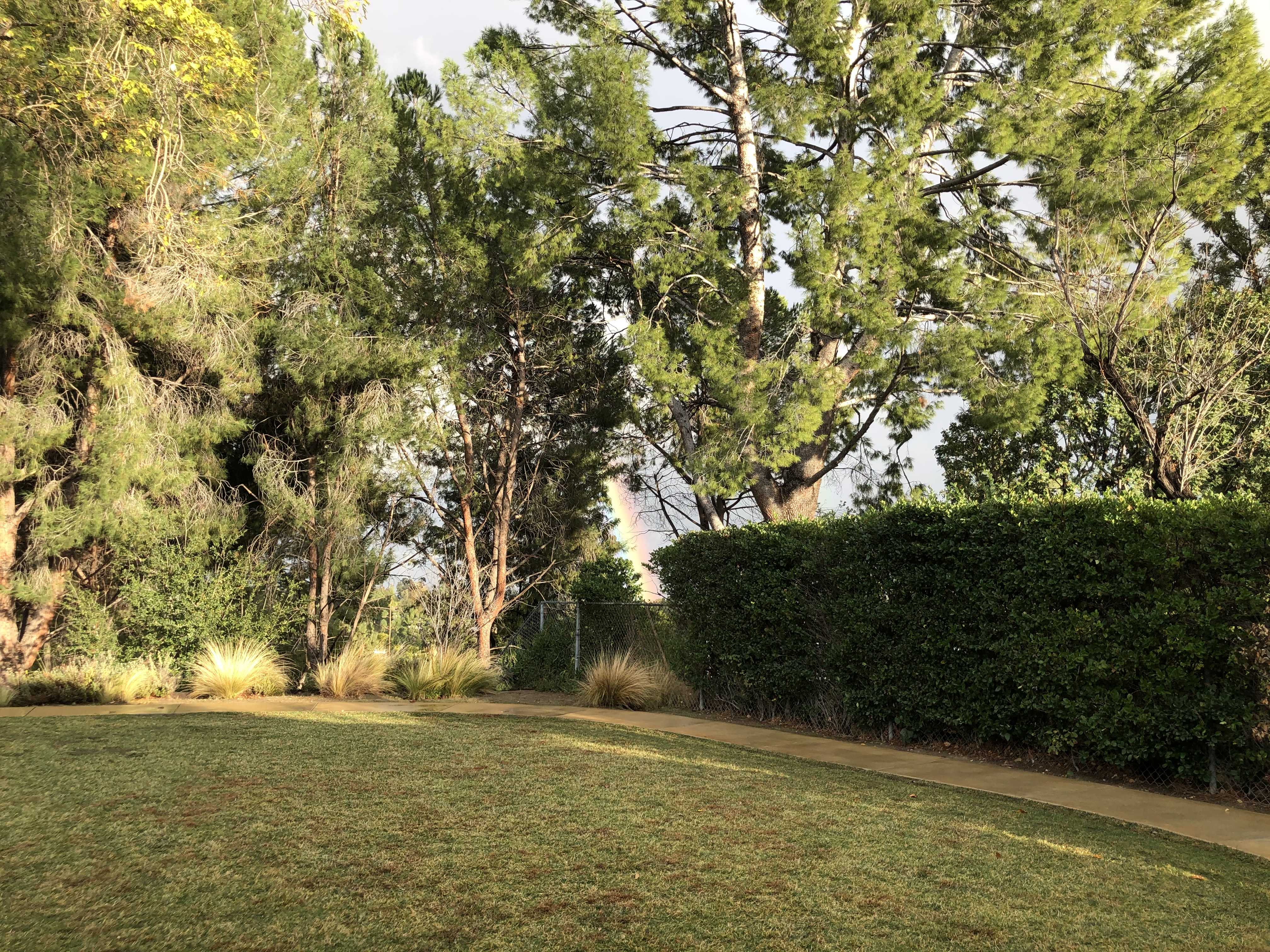 Scattered showers all day after some pretty solid rain last night. Great! We needed it! Finally, this afternoon about 16:00 I noticed some sunlight out in front. But it still looked damp and drizzly. Good conditions for rainbows, right? Low, bright sun in the west, dark, moody clouds in the east, drizzle in between?