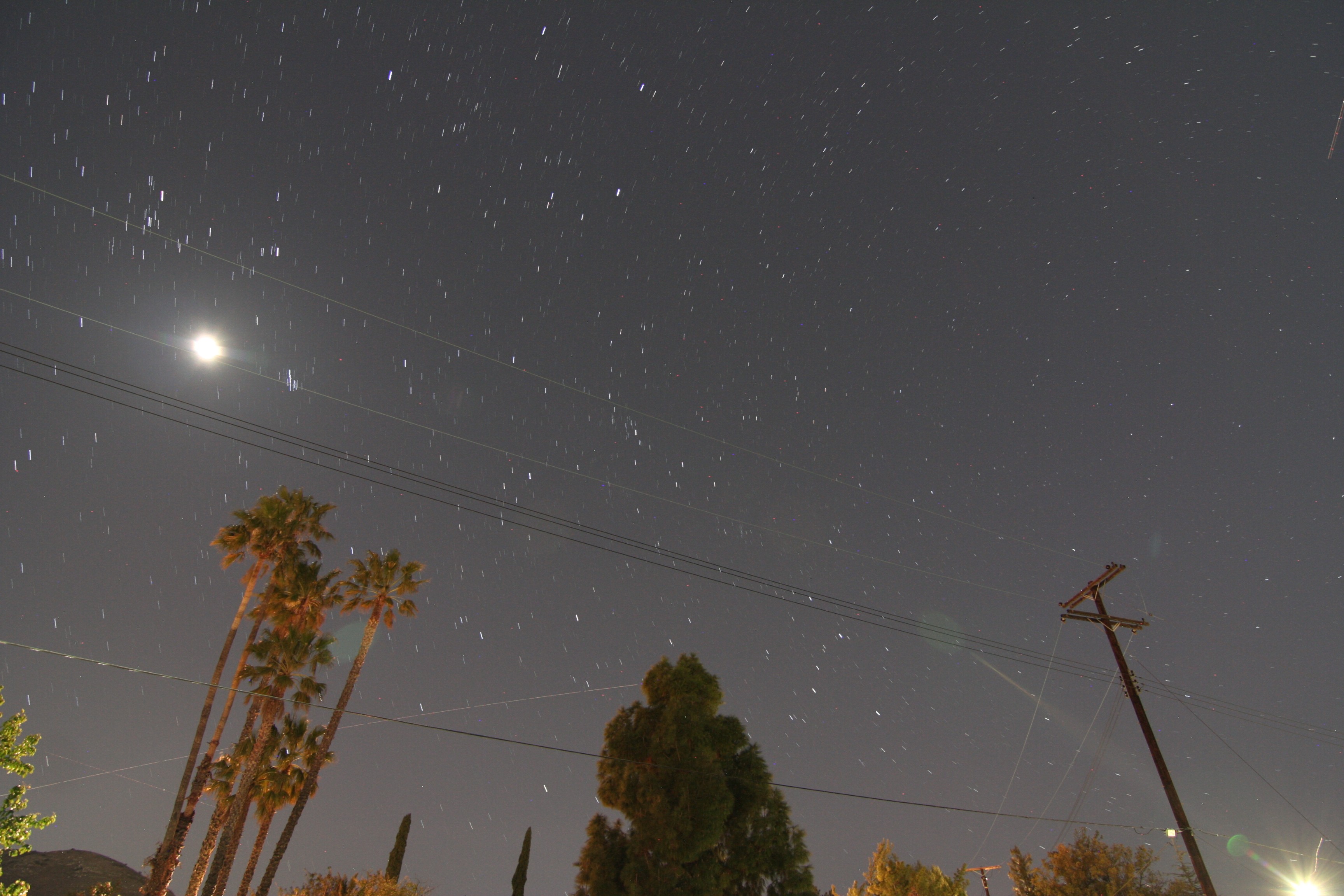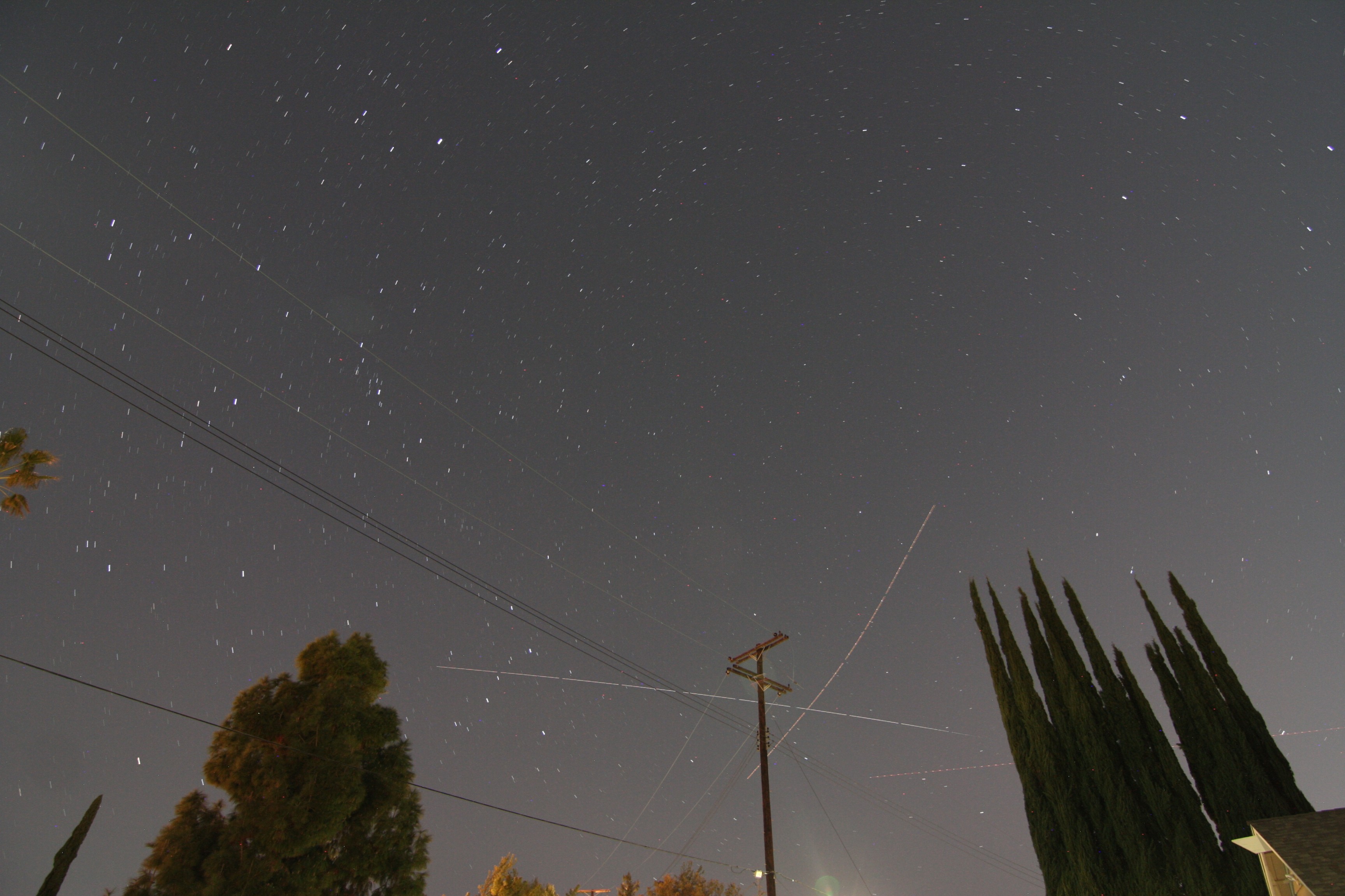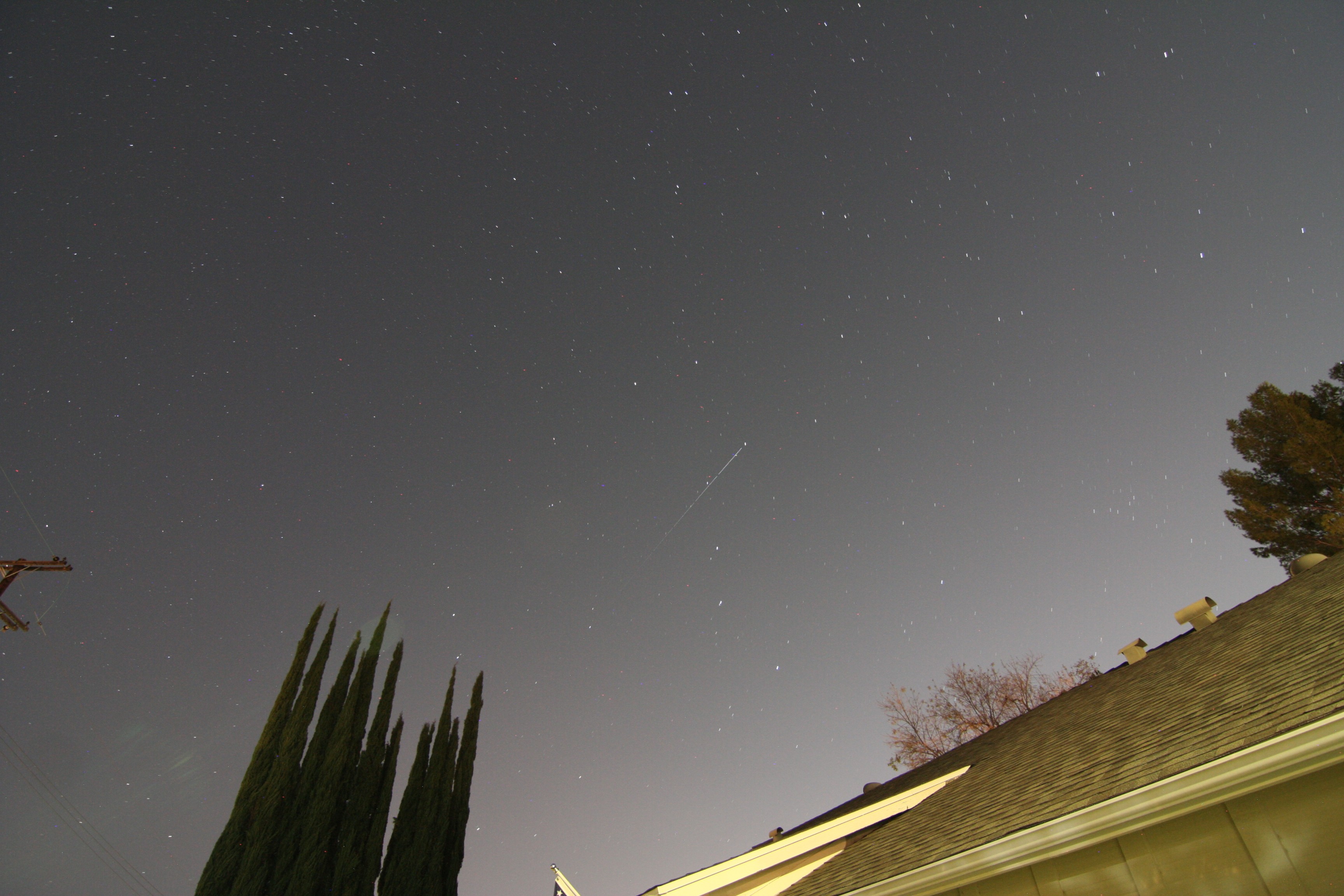 Shift a little to the right as the ISS clears the big pine tree, only to watch it fade into orbital night just before it gets to the Italian cypress trees. The airplane track starting just above the cypress trees and heading north (bottom center)? That’s Fedex #1839 from San Diego to Oakland, at 36,000 feet.