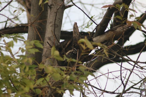 Over the next couple of weeks I would hear her banging away on some nearby tree every now and then, but rarely had a chance to even spot her at all, let alone get my camera and snap a picture. But eventually I caught her roosting and resting way, way up in that huge tree in our back yard: