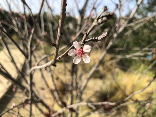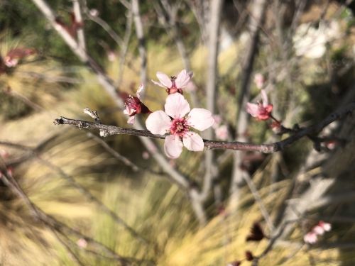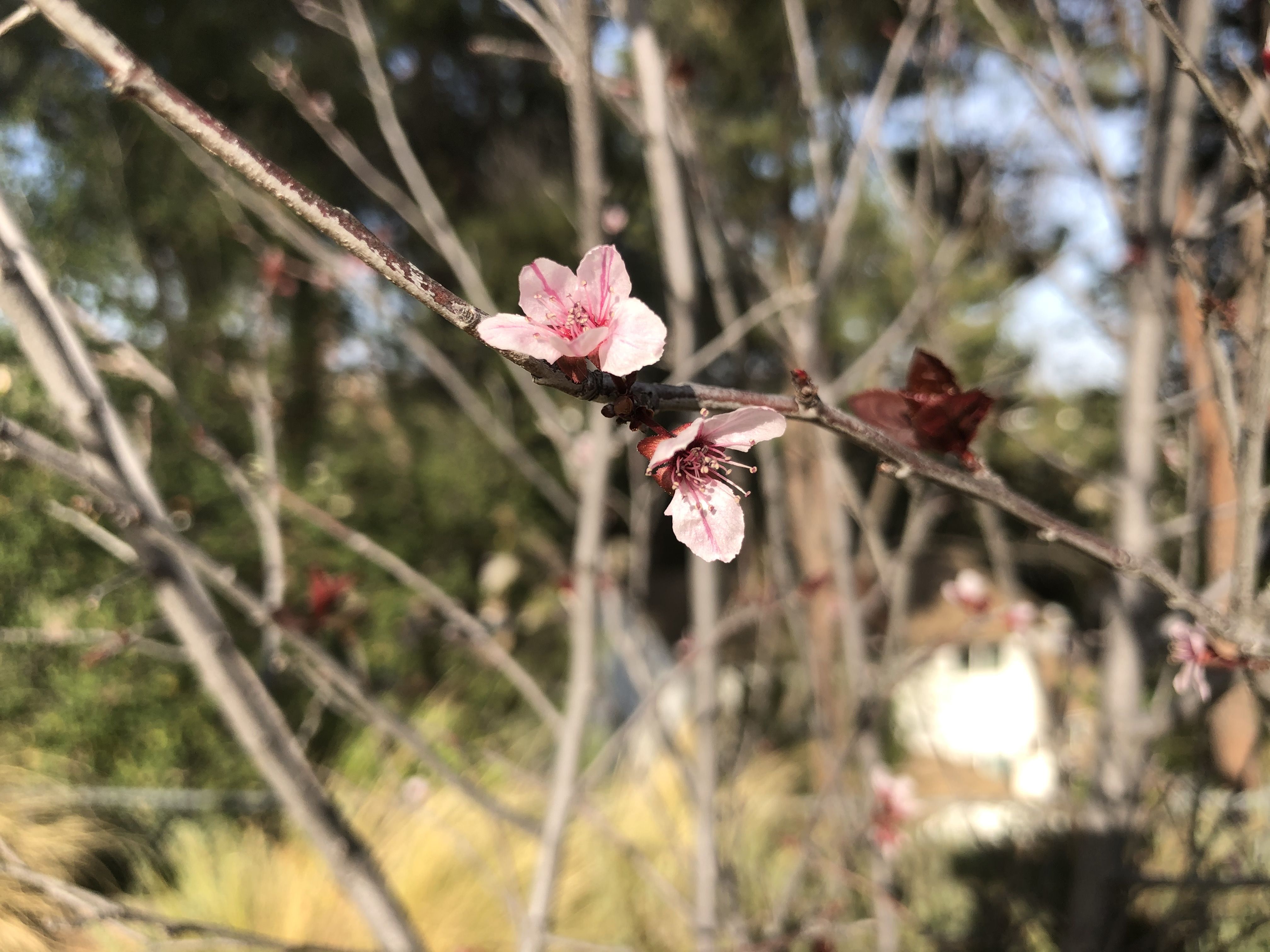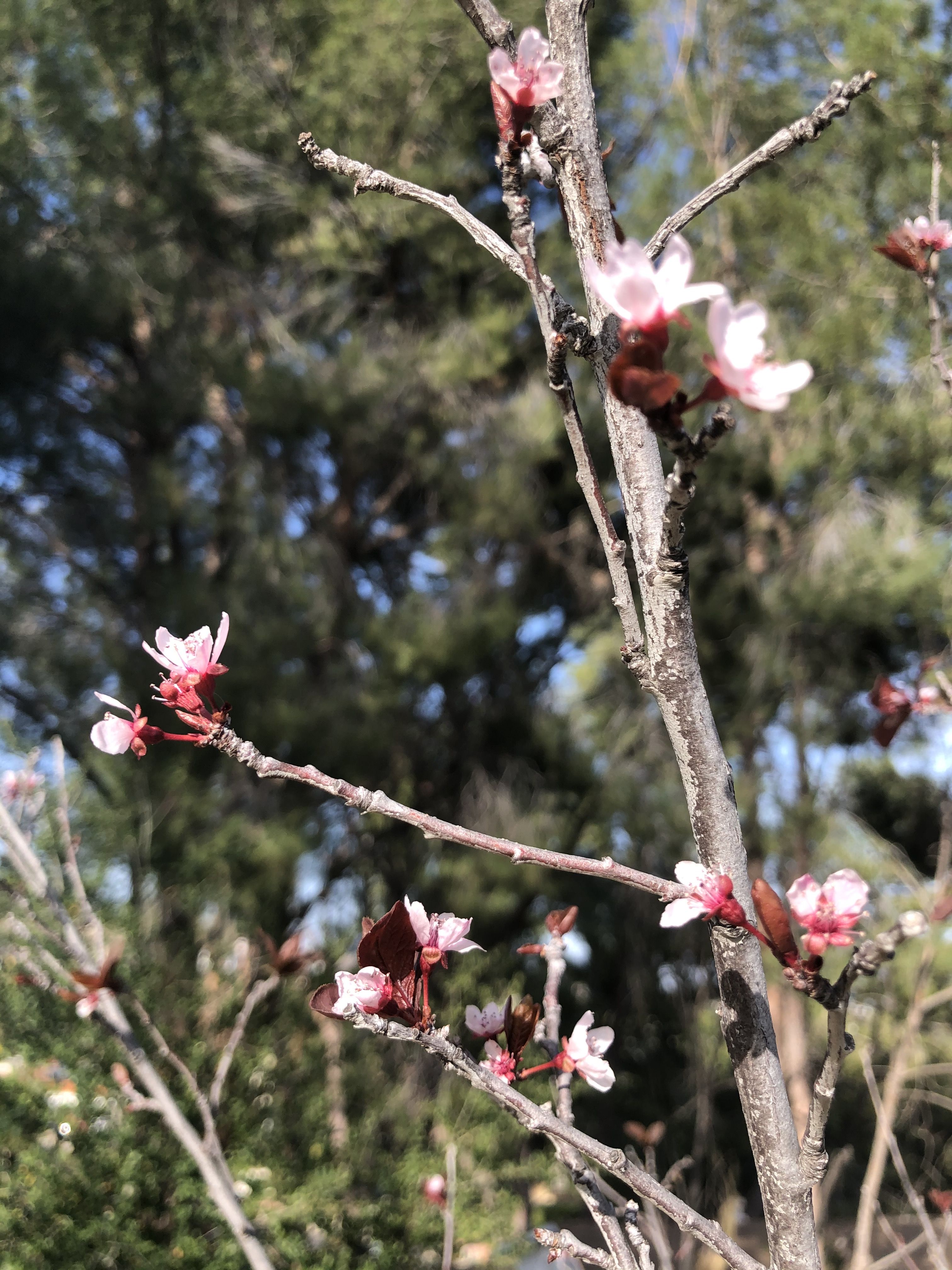 “Purple leaf flowering plum” according to the wisdom of Google image search. These tiny little pink and purple flowers are starting to pop in the last couple of days.