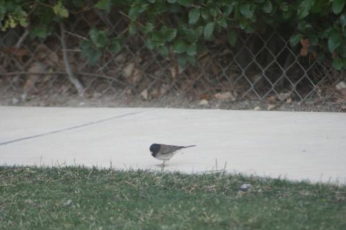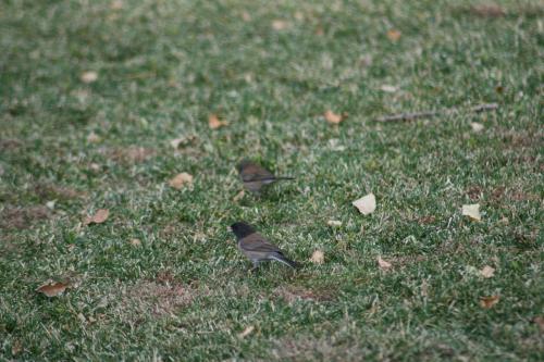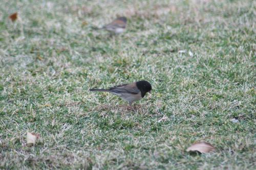 These are Dark-eyed Juncos, a type of sparrow. They apparently have a lot of color variation between different populations, which you can see in looking at these pictures. But the basic “chunky Junco” body, black head, white belly design is consistent. There just may be differences in detail in the grey areas.