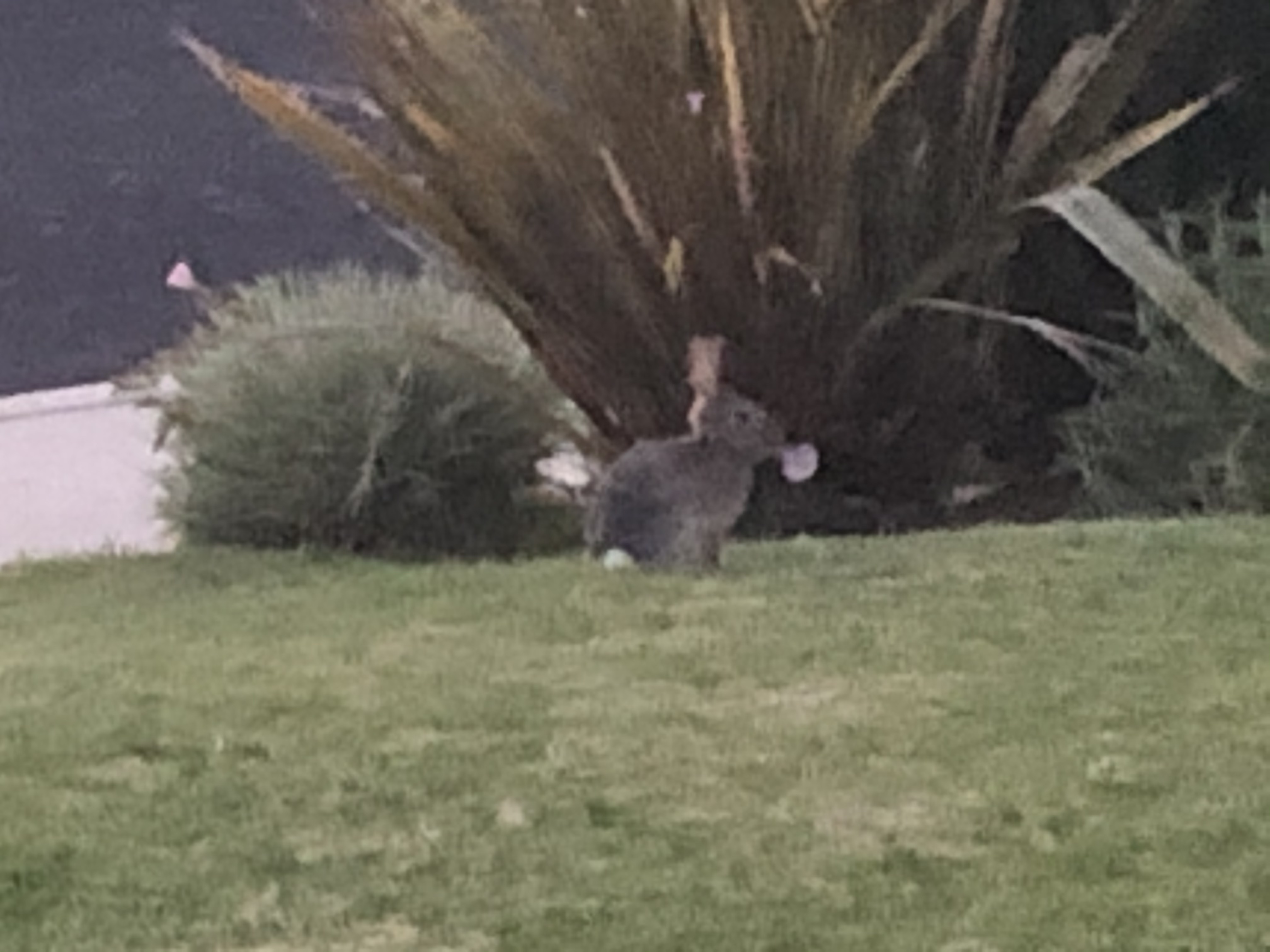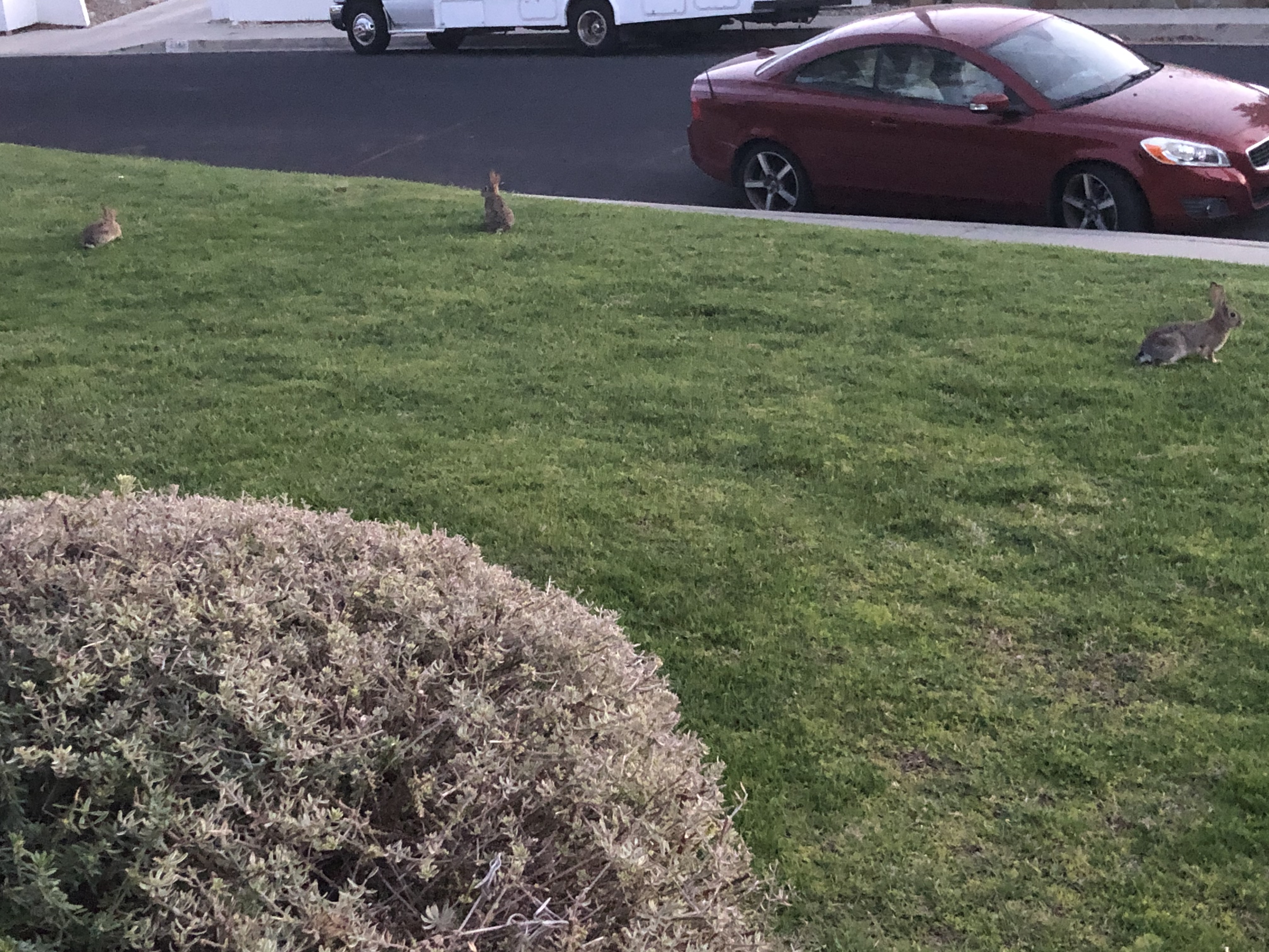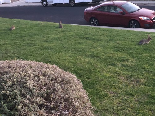 I mentioned a few days back that we have a growing collection of rabbits that hang out on our lawn at sunset and sunrise. Coyotes don’t want to climb the hill – that’s my theory and I’m sticking to it.