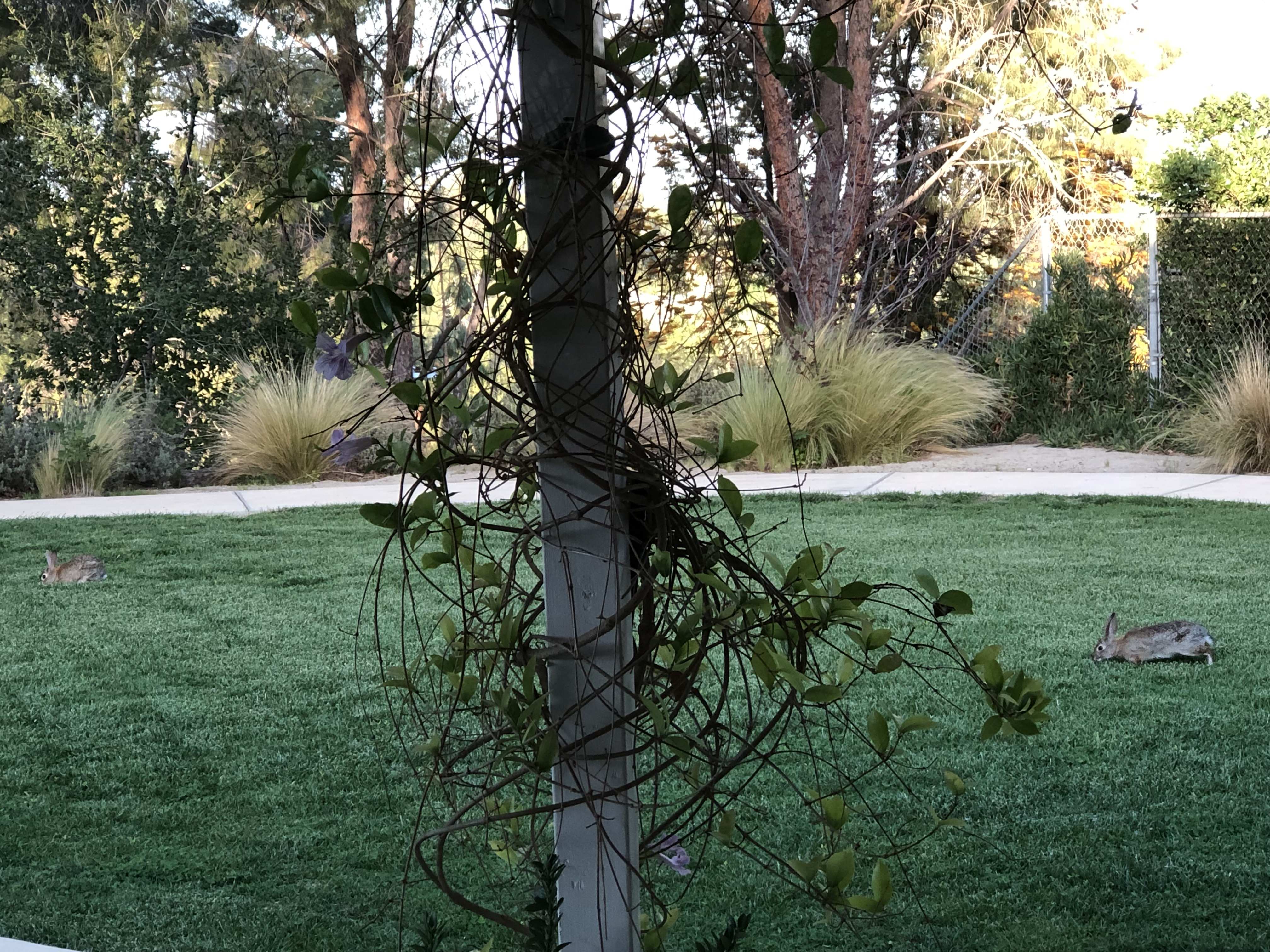 The big crowds of bunnies that occur in the front yard don’t happen until well after dark. Earlier, starting a half-hour or so before sunset, there’s usually two rabbits in the back yard.