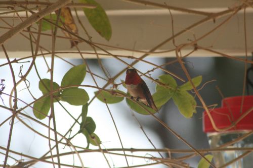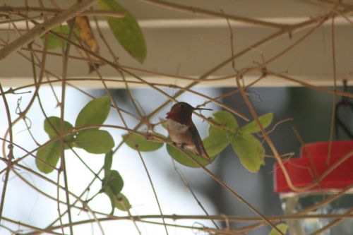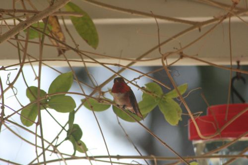 I had noticed, briefly, because these little flying gremlins are quick, a flash of red on one of the hummingbirds zooming around the yard. With the new feeders, there are more of them – “more” meaning that it seems at swarming/feeding time just before sunset there are maybe 8-10 of them zooming about instead of 4-6 of them. I know we have Rofous hummingbirds, and we have what I think are black-chinned hummingbirds.