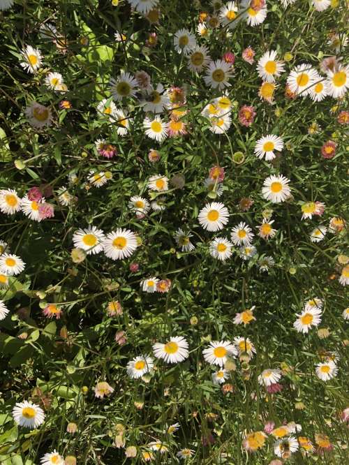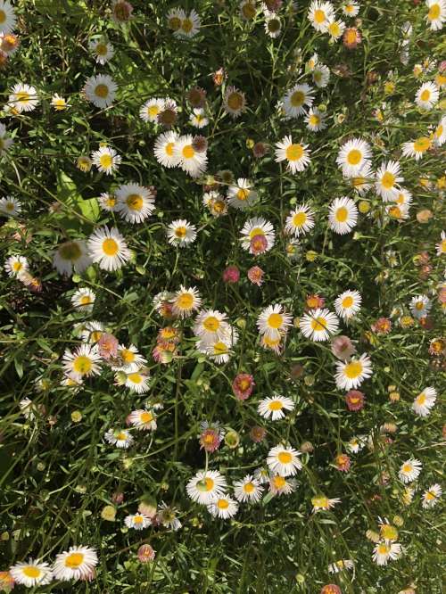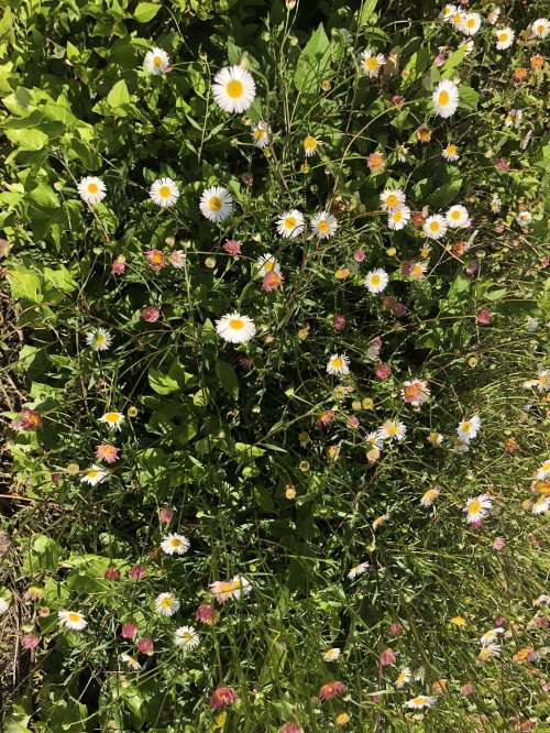 I don’t know what sort of flowers these are, although I might guess that the white and yellow ones are some sort of daisy? I don’t know about the smaller reddish and yellow ones.