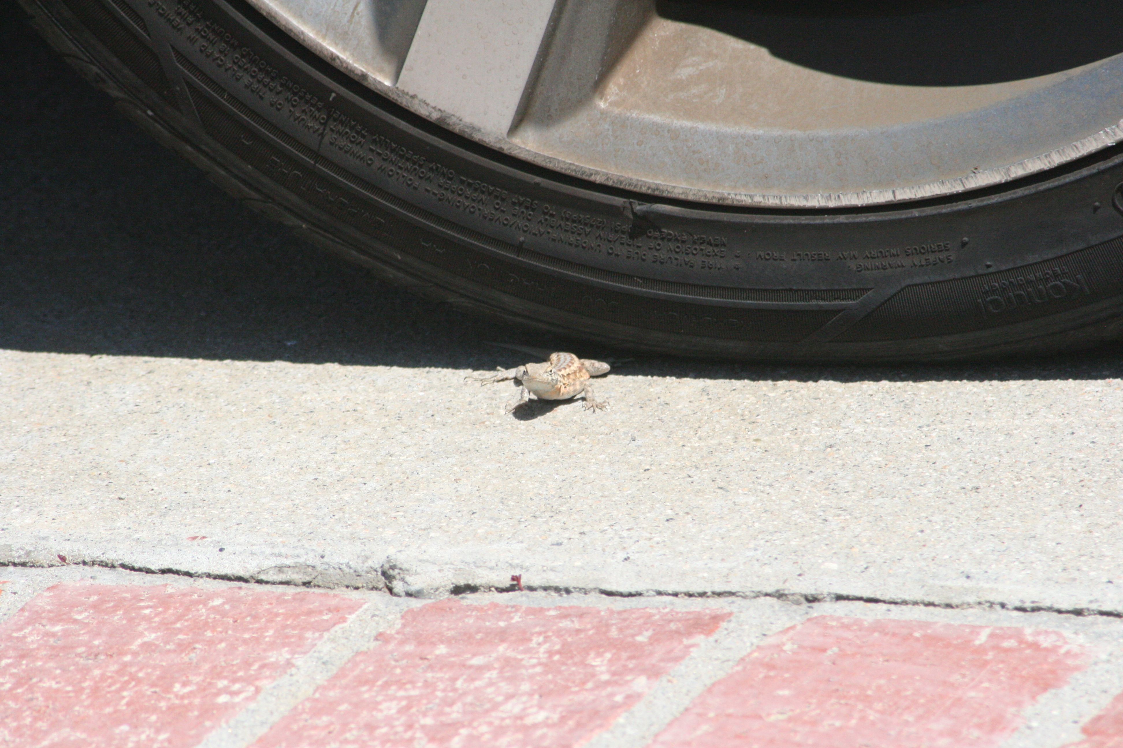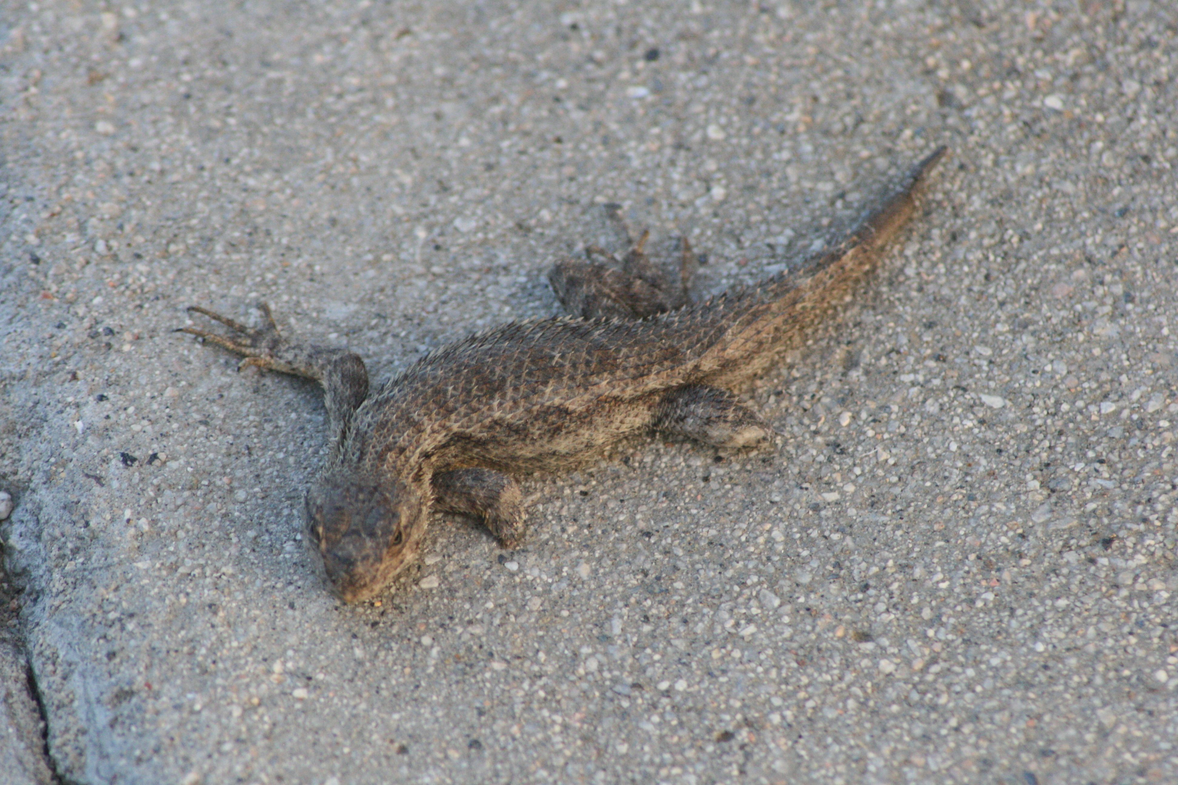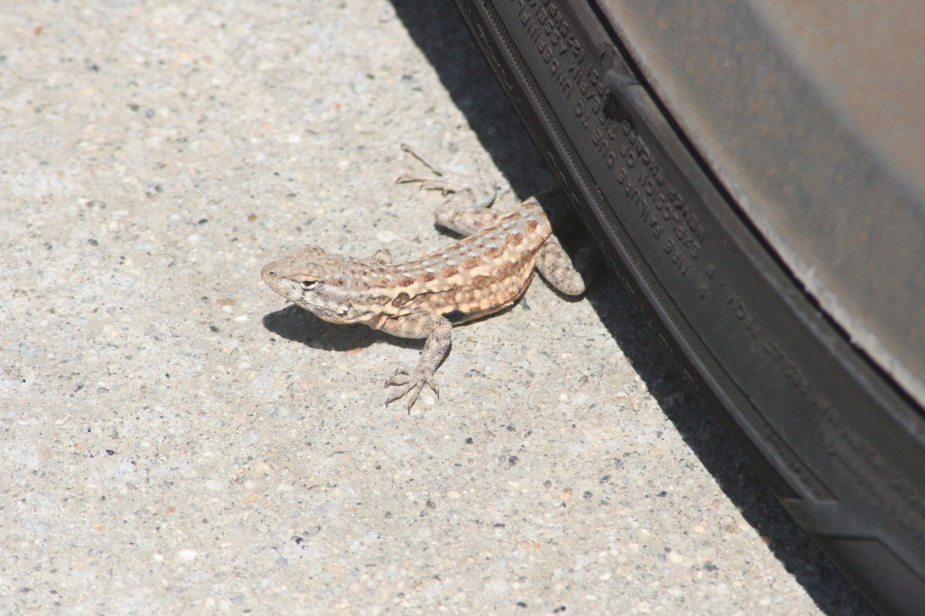 Last weekend I saw two lizards soaking up photons from the hot driveway, one of which is (I believe) the legendary Doctor Lizardo, and the other a darker, almost jet black lizard with a missing tail, who I was thinking of calling “Stumpy.” Then earlier this week I saw a third lizard out there, a smaller, light tan colored youngster, along with “Stumpy.”