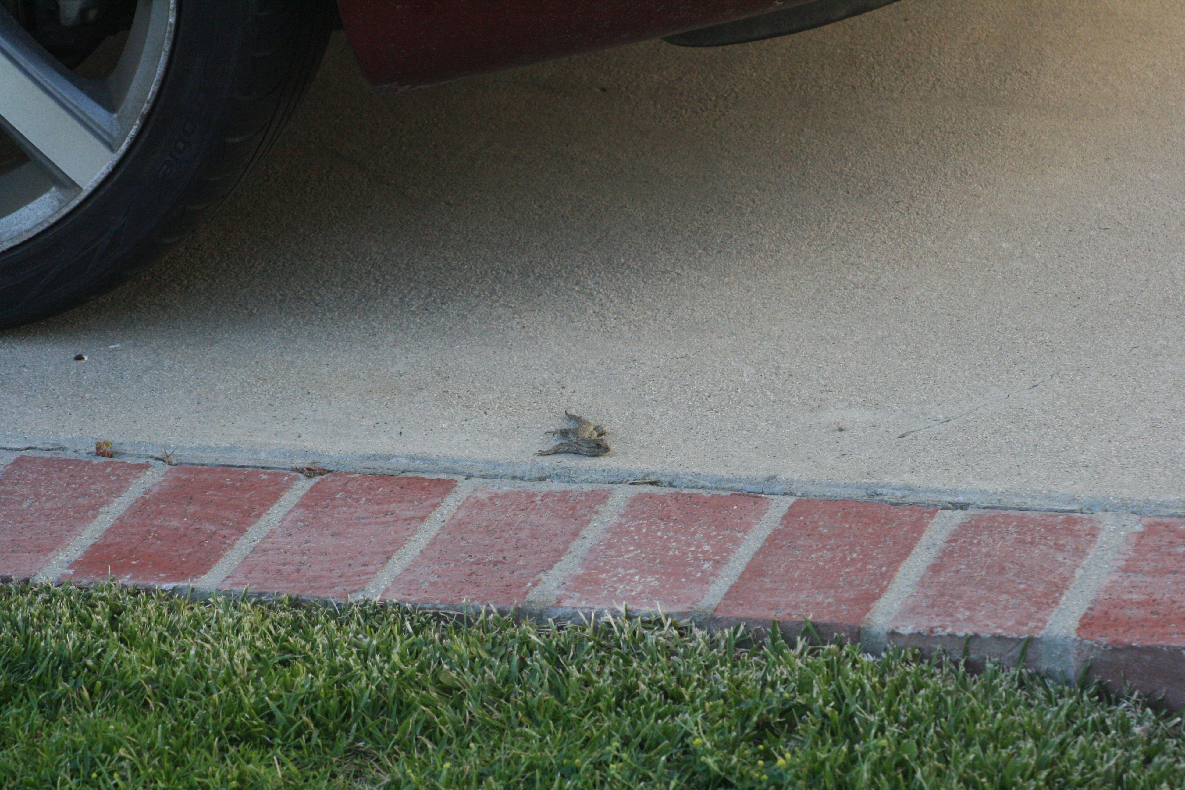 He never moved a muscle except to swing his head around to watch me, even though I was starting to get pretty close. In fact, I got so close that I couldn’t focus the telephoto lens. I was down on my knees about three feet away and stumbled when I tried to scoot back a foot or so. The he turned and took off under the car and down the driveway that I lost sight of him immediately.
