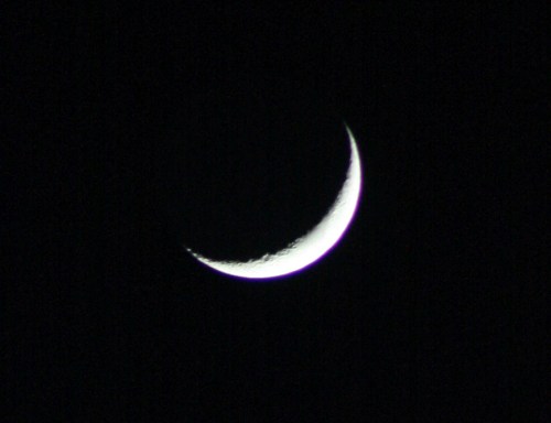 The Moon is about three days past new, so along the terminator line you can start to see some nice shadows in the craters. This is using the big lens at 300 mm.
