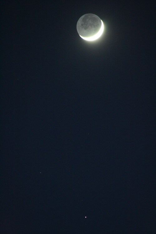 I thought that the Moon would still be close enough to Venus to be captured in one frame using the 75-300 mm zoom lens – NOPE! Too far apart tonight. So I had to go back into the house and get the camera with the 18-55 mm “normal” lens. Zoomed in to 55 mm, you can just get the Moon at top left, Mars directly below it, and Venus just quite not setting in the lower right. Good thing that gap in the trees is there and my front yard is a bit elevated. What a glorious thing a flat western horizon would be!