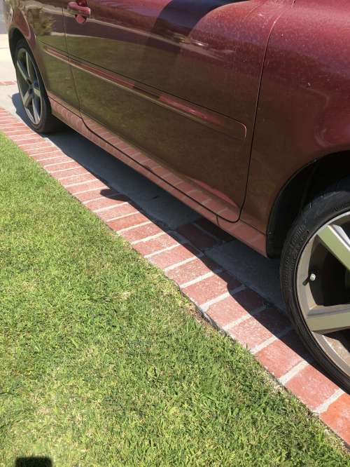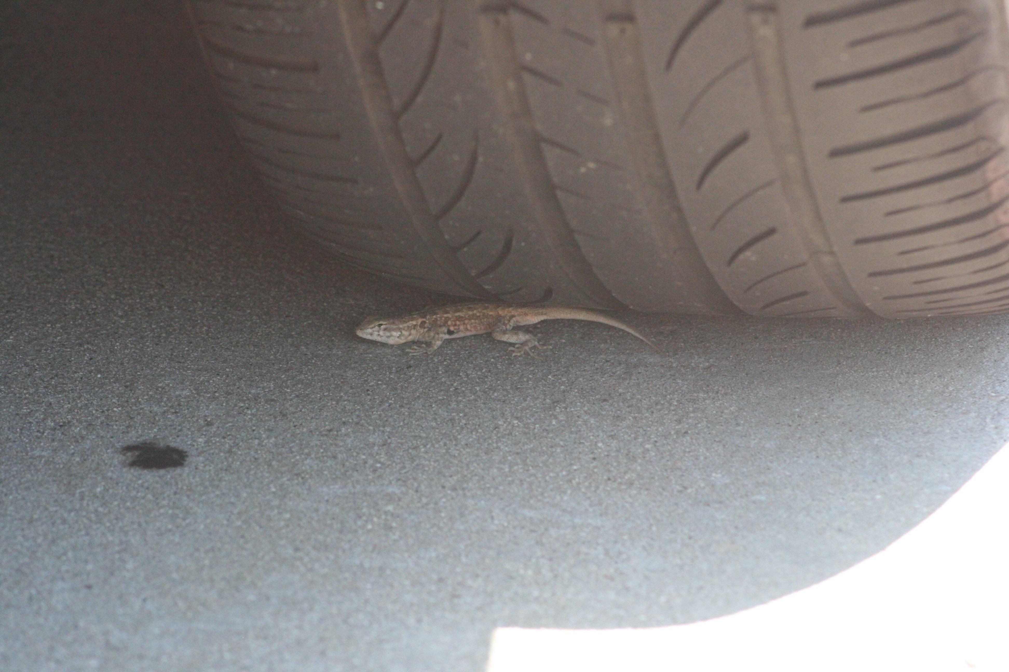 I went out today to find a better resting place for Monsieur Badass than the middle of the driveway under Hissy’s wheel. While the ants and crows might have appreciated it, the bushes where he used to hide seemed more appropriate. When I looked up from placing him there, I spotted something under the Volvo.