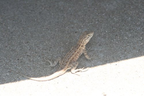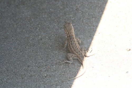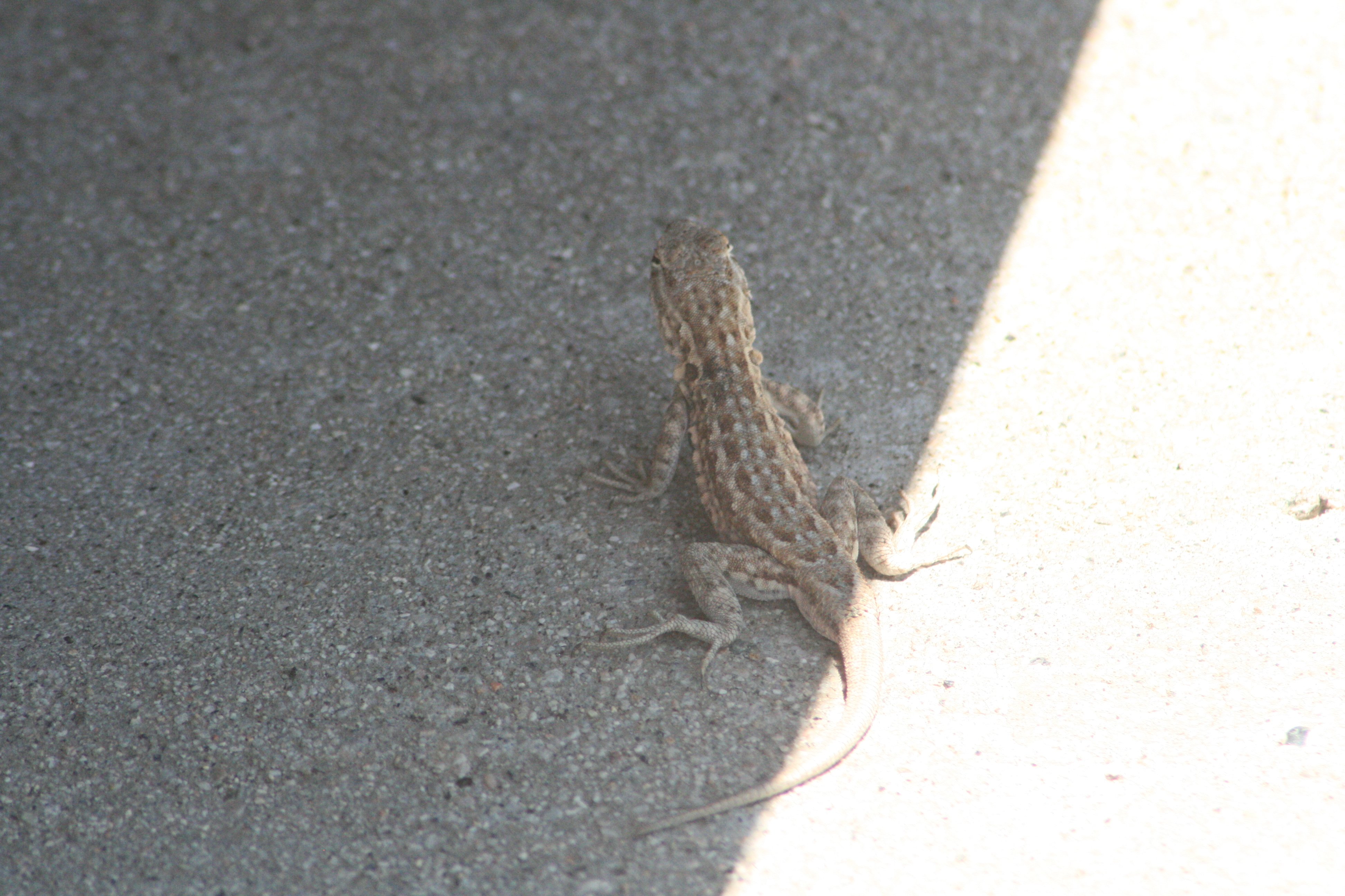 Looking back, this dude (or dudette) has very distinctive markings and coloration. Those big black splotches behind the front legs, that regenerated tail, the big 3-D spots or warts above the front shoulders, the desert camo coloration.