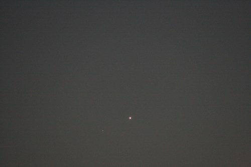 There it is! Just about eight hours from their (apparent!) closest approach to each other. The word “apparent” is key here. Remember, we’re all gravitationally bound (for the moment) to giant balls of rock, water, and gas, which are in turn spinning on their axes, which in turn are in orbit at thousands of miles an hour around a small, yellow, G-class star, so while they look close together from this particular point of view, they’re actually 74,400,000 miles apart from each other.
