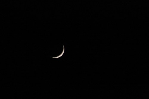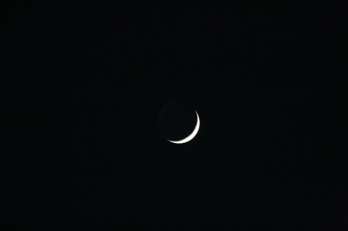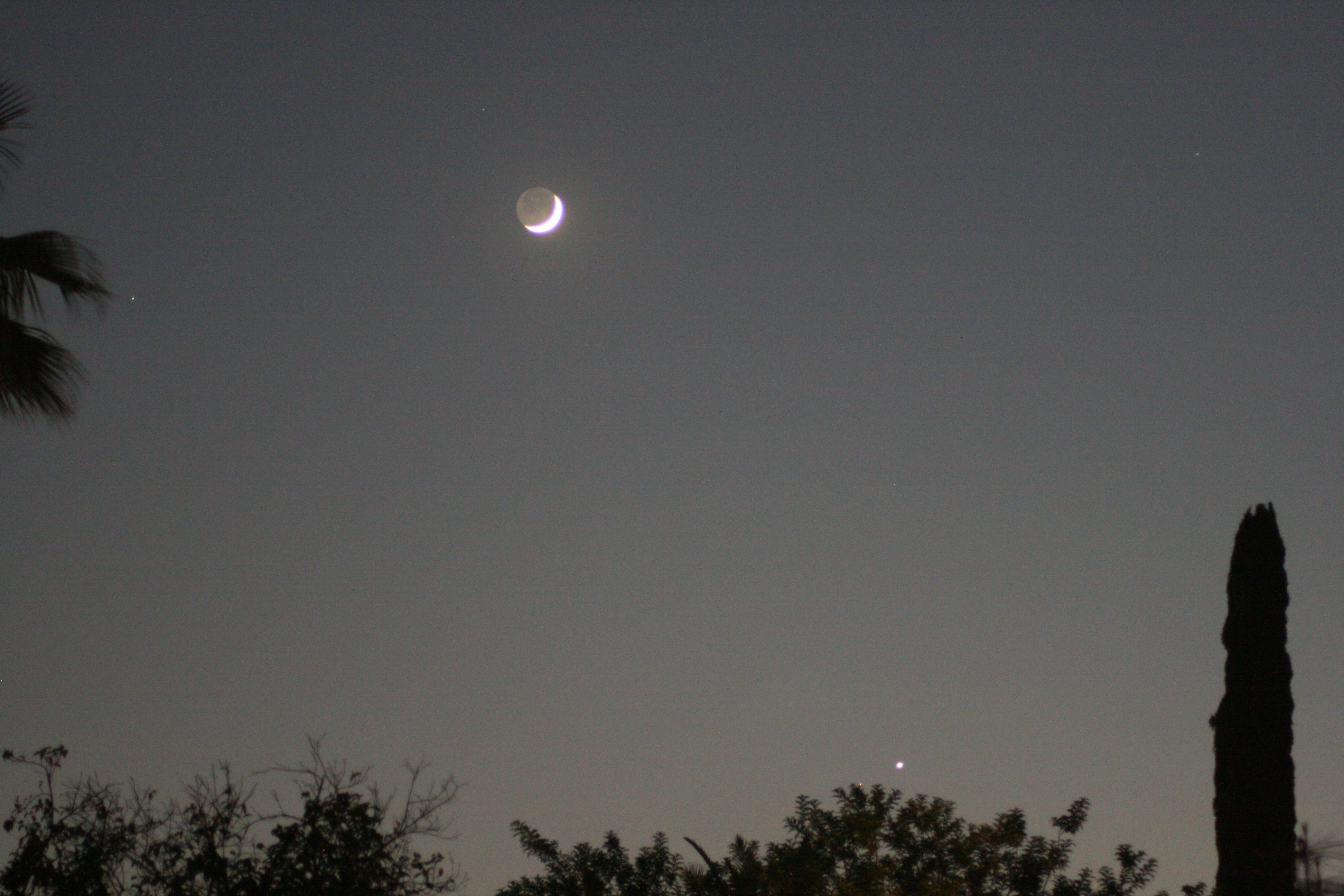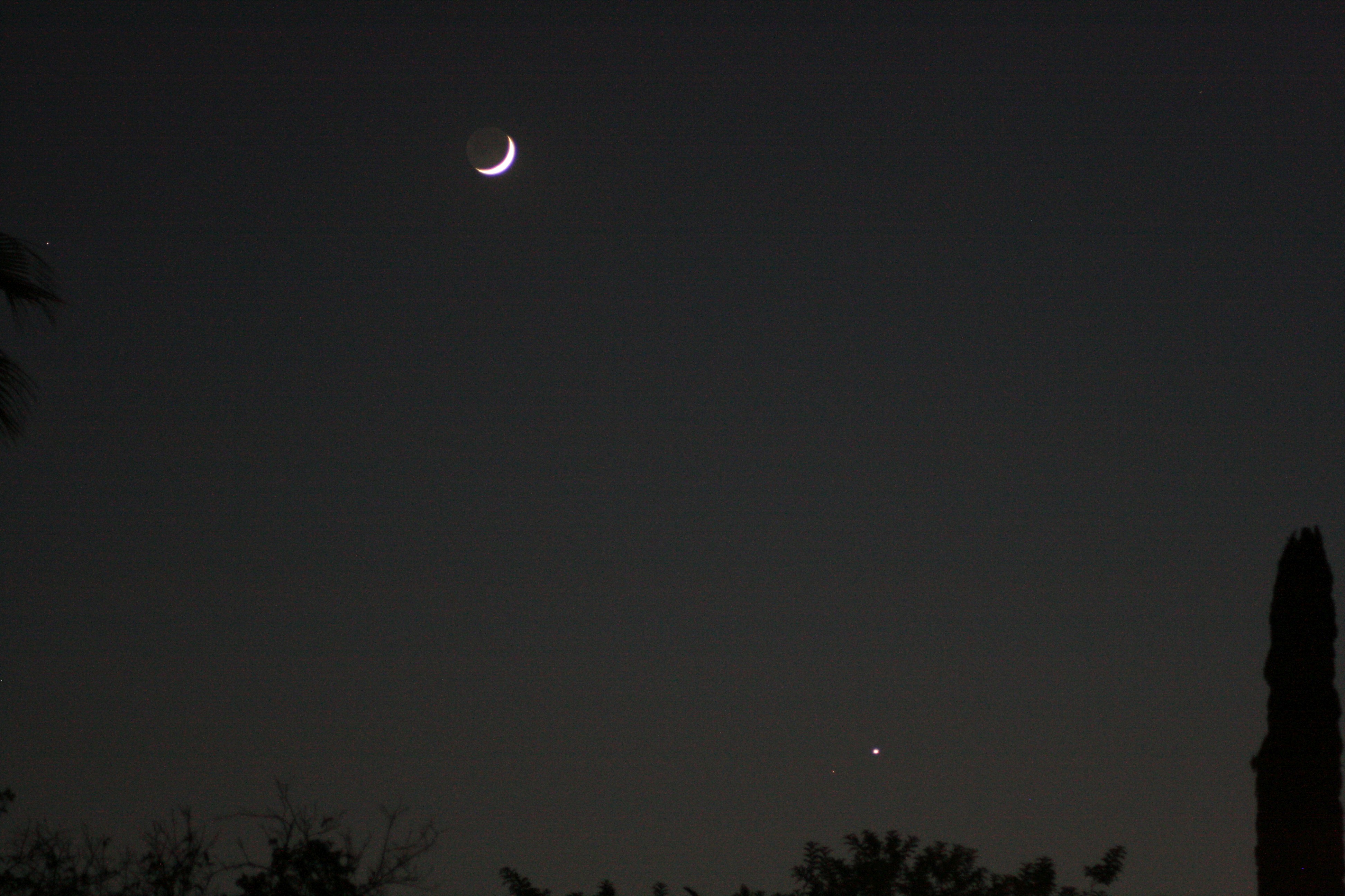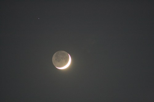 While the Moon, exposed to bring out detail at the terminator, is a fingernail crescent…