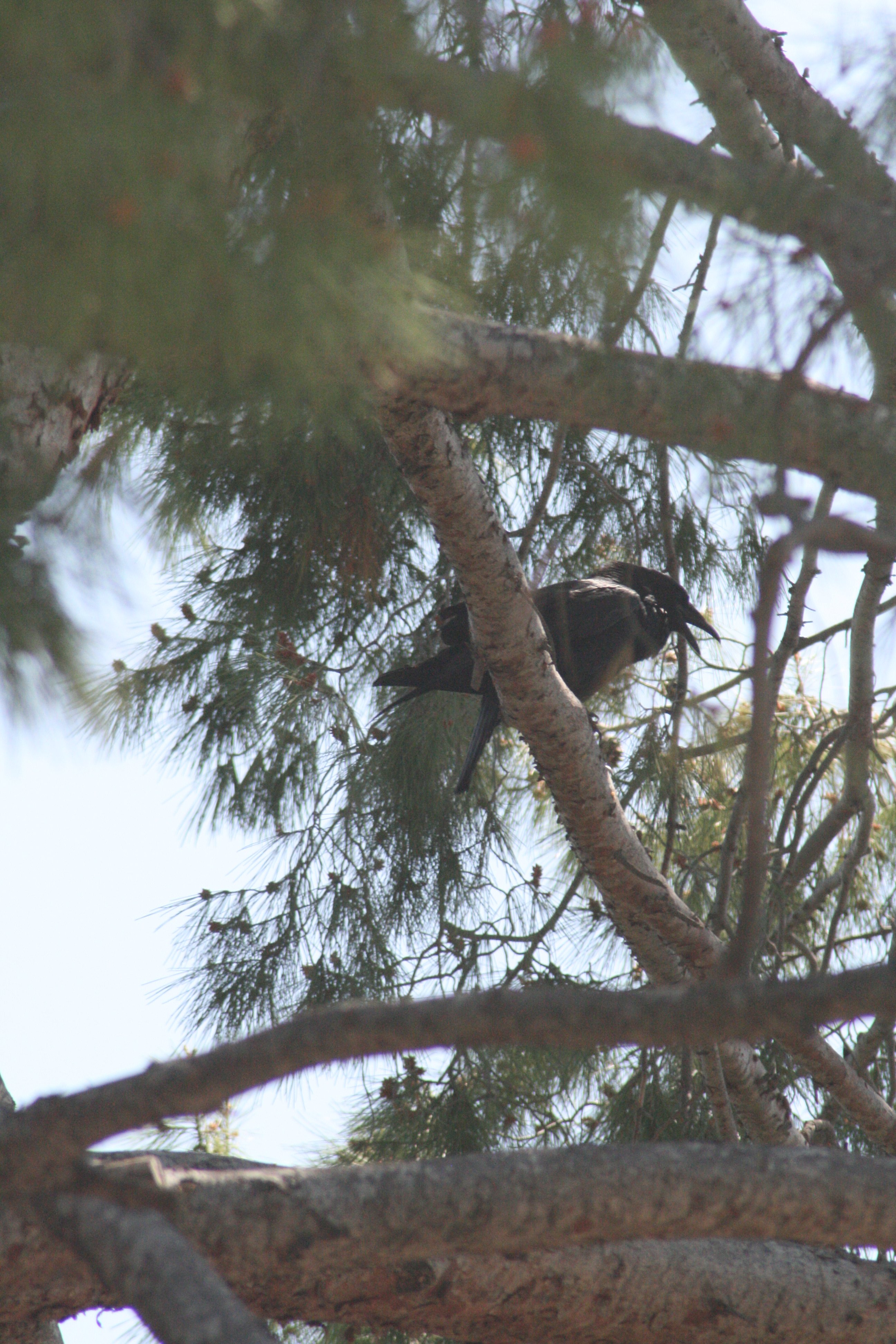 In general, another trait I notice is that the ravens will perch lower down – on top of telephone poles, in the lower branches of the pines out in back, and so on. The crows seem to perch way up in the top of the trees.