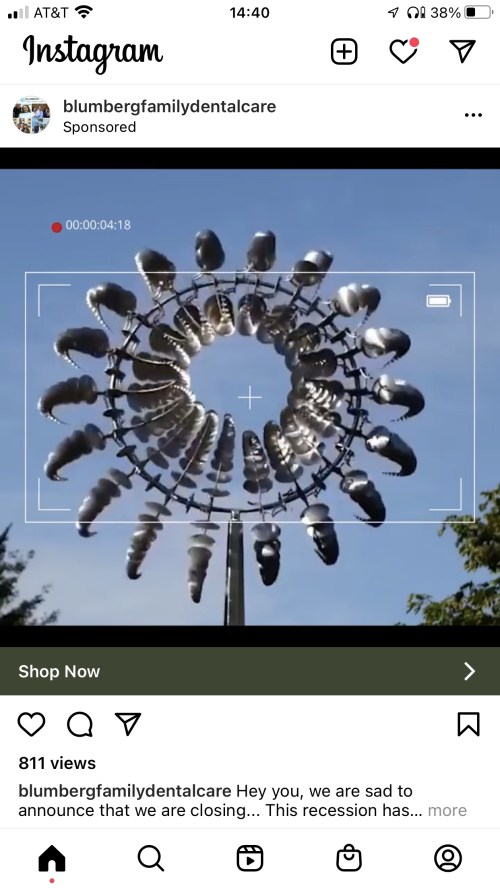 - Can I never again see one of these spam ads online? I’ve lost track of how many HUNDREDS of them I’ve seen (and deleted and blocked and muted and cursed to Hell) over the past two months or so. It’s always the exact same video and always the exact same text, even though the “sponsoring” account is always different. “blumbergfamilydentalcare” is selling these kinetic art pieces instead of, you know, doing family dental care?