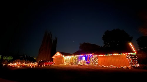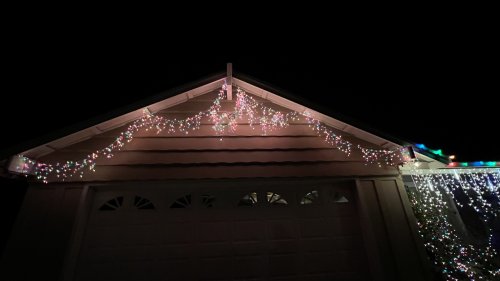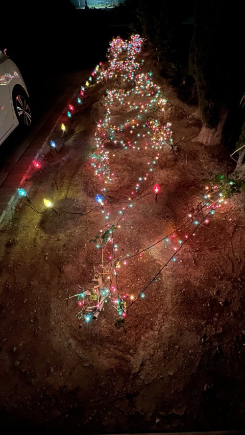 Above the garage door the “spider’s nest” of colored lights got hung. It is so tempting to take that big Halloween spider ornament and hang it in the middle of this!