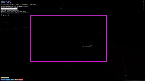 I looked for a bit, looked away and looked back to find it again and verify that I was actually seeing it. It did NOT look like the pictures folks are taking from the Southern Hemisphere with big telescopes. But where all of the stars I could see were pinpoints, this was a tiny, fuzzy fuzzball with a slight greenish tint and the tiniest bit of tail, pointing off to about the 10:00 position. (Ignore the orientation of the tail on the Sky Live map, it’s just an icon. The real tail will point straight away from the Sun, so to the upper left.)