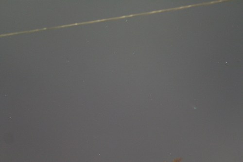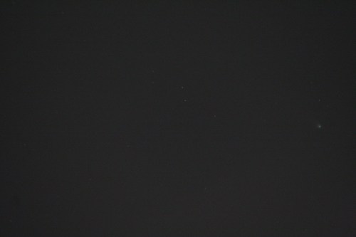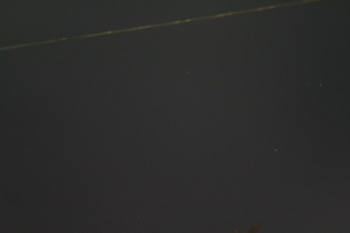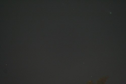 Using this “carpet bombing” approach and using lots of cheap memory instead of film, there are a few captures. The comet isn’t centered since I was shooting blind. but over on that right hand side, slightly below center, you’ll see a greenish fuzzy spot, which is Comet Leonard. (The bright yellow line at the top is a power line, illuminated by that freakin’ streetlight just over my head.)