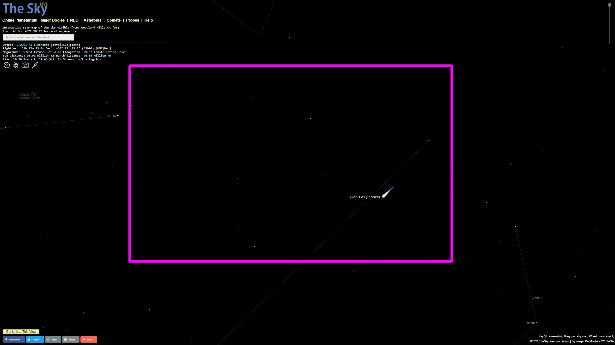 Note that there are three bright planets in this view and they can be your guideposts to look. Jupiter is at the top center (really bright), Venus at the bottom right having juuuuuust set in this view (really stinkin’ bright), and Saturn between them (bright). So in rough terms, right now Comet Leonard is a little to the left of a line dropped straight down to the horizon from Jupiter, and a little bit higher than Venus, maybe a third of the way up higher than Saturn is compared to Venus.