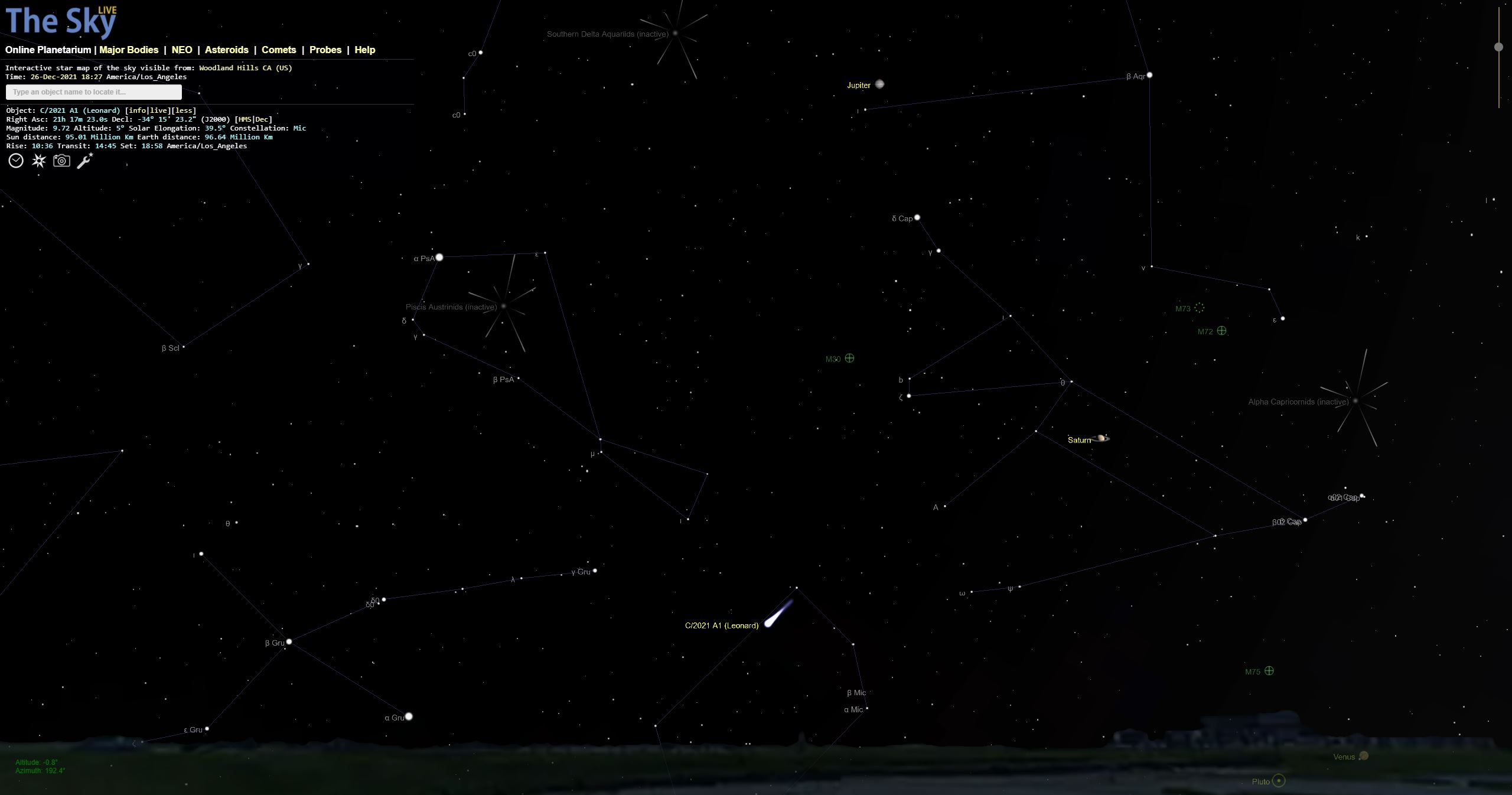 If you want to try to find it, there are a couple of ways to know where to look. First of all, there’s a great site at The Sky Live. Change the location in at the top (unless you too are in Woodland Hills, CA) and scroll down to the map. Tonight, just before 18:00 local, mine looked like this: