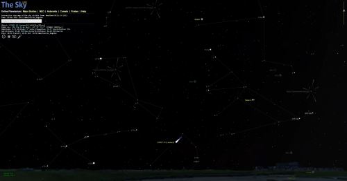 I looked for a bit, looked away and looked back to find it again and verify that I was actually seeing it. It did NOT look like the pictures folks are taking from the Southern Hemisphere with big telescopes. But where all of the stars I could see were pinpoints, this was a tiny, fuzzy fuzzball with a slight greenish tint and the tiniest bit of tail, pointing off to about the 10:00 position. (Ignore the orientation of the tail on the Sky Live map, it’s just an icon. The real tail will point straight away from the Sun, so to the upper left.)