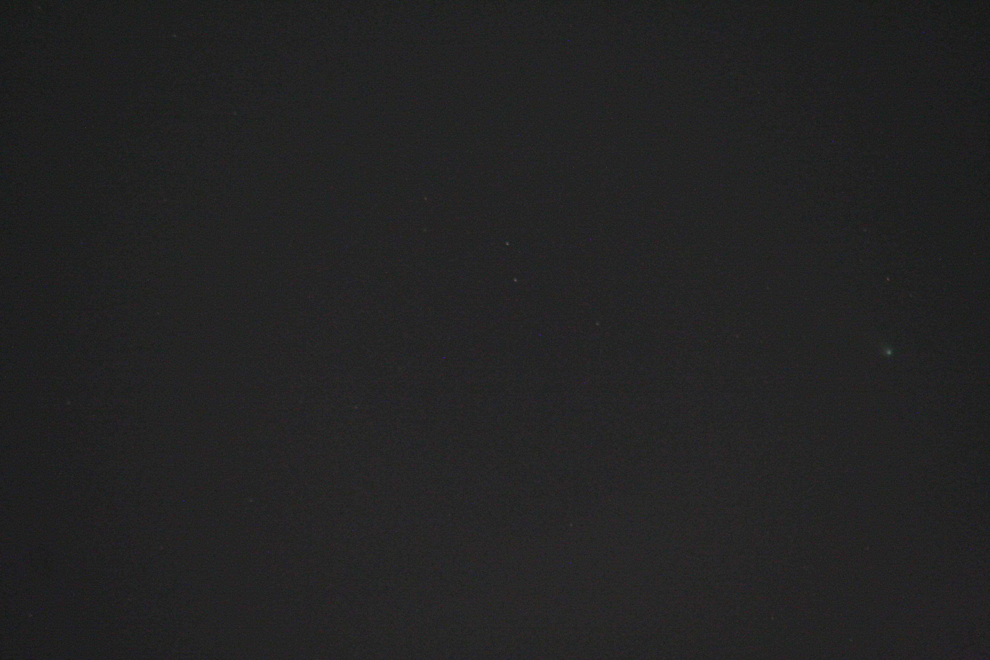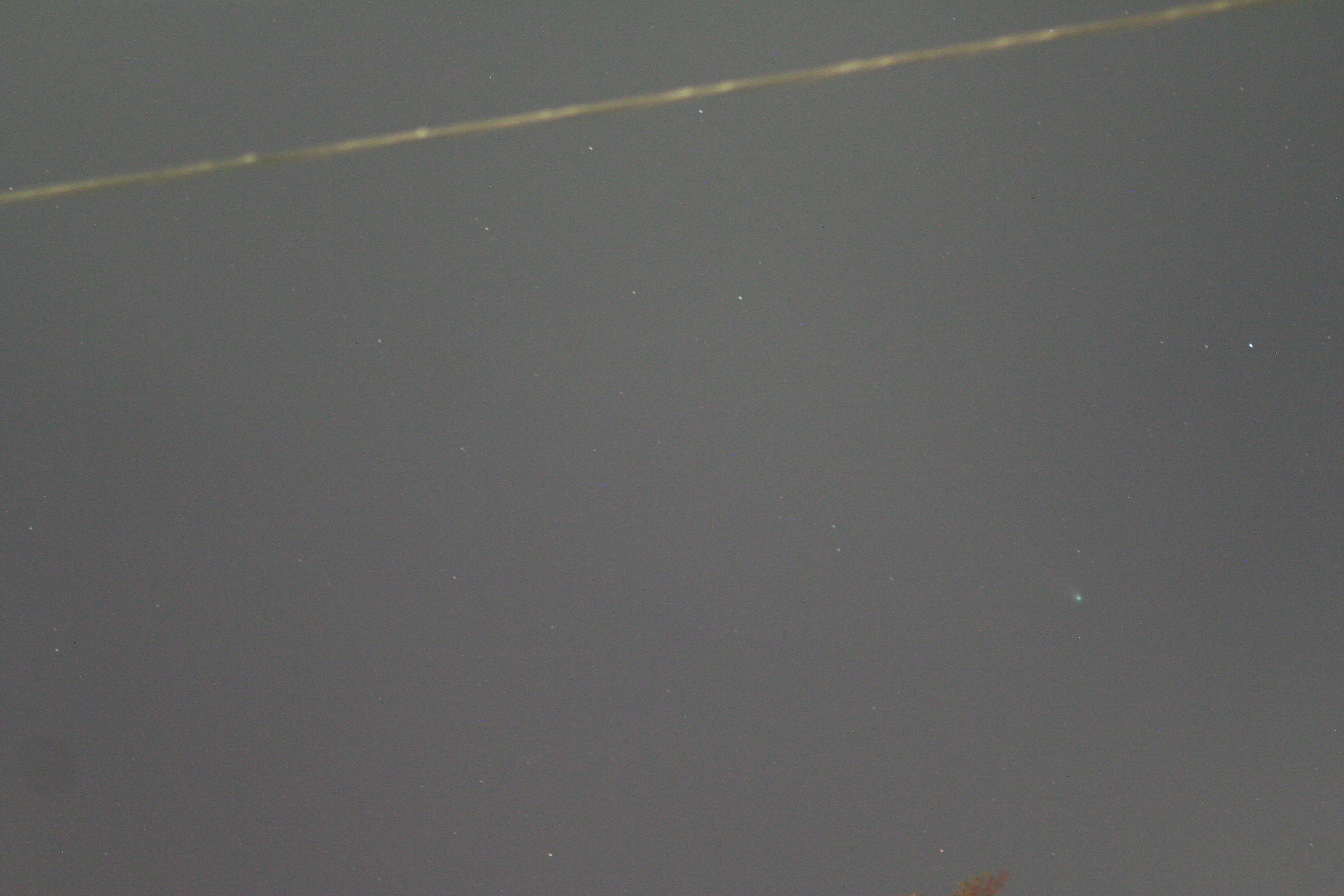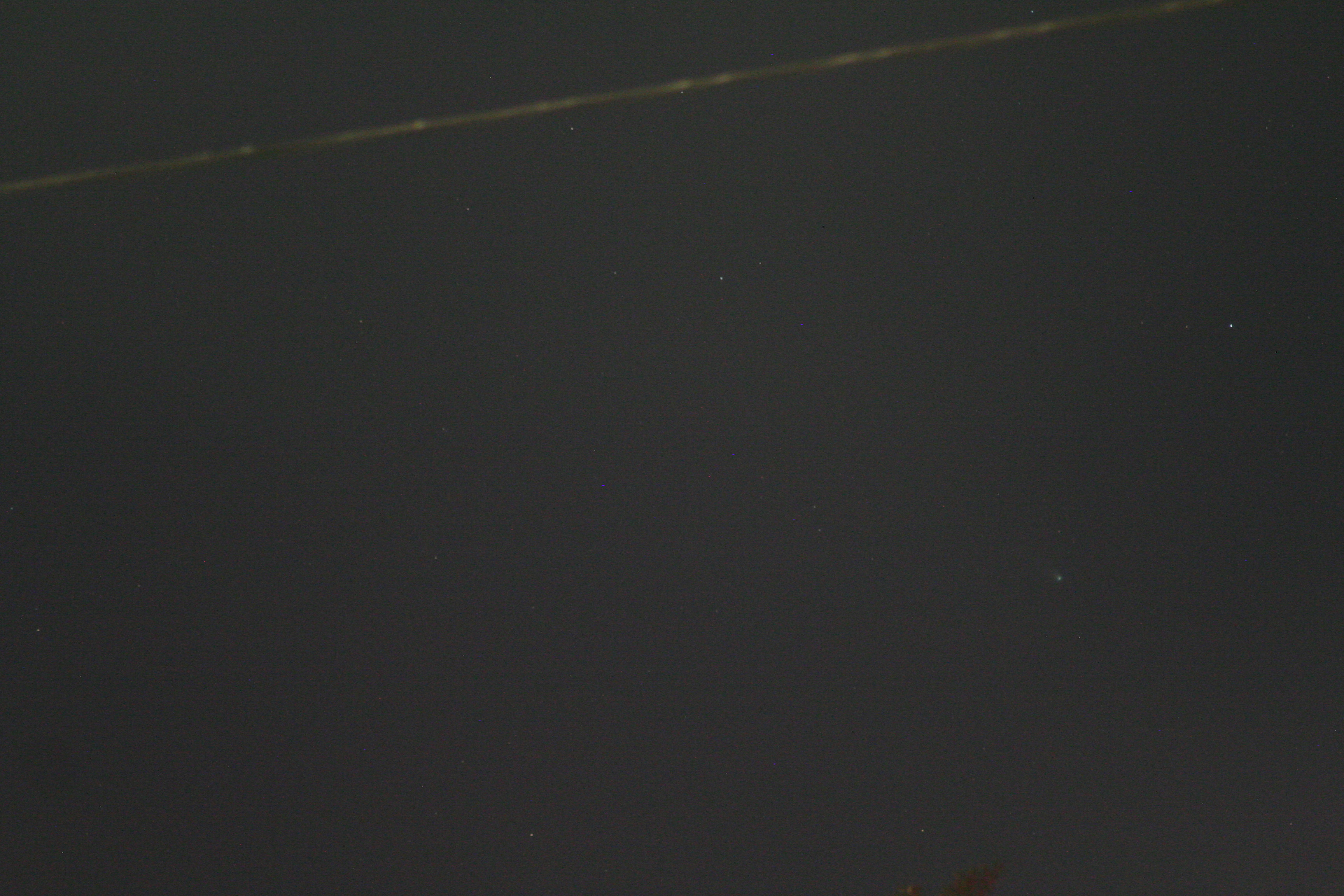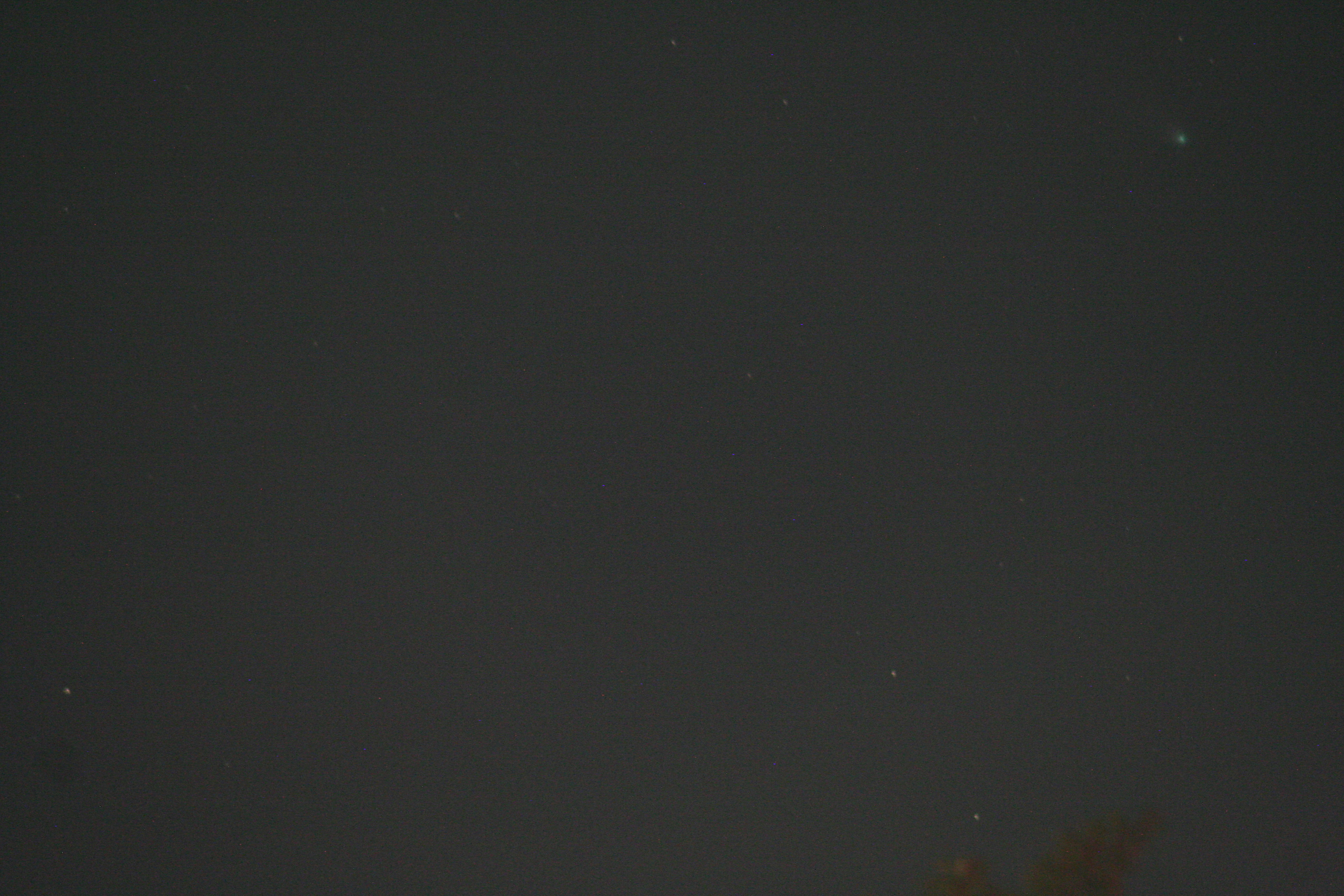 Using this “carpet bombing” approach and using lots of cheap memory instead of film, there are a few captures. The comet isn’t centered since I was shooting blind. but over on that right hand side, slightly below center, you’ll see a greenish fuzzy spot, which is Comet Leonard. (The bright yellow line at the top is a power line, illuminated by that freakin’ streetlight just over my head.)