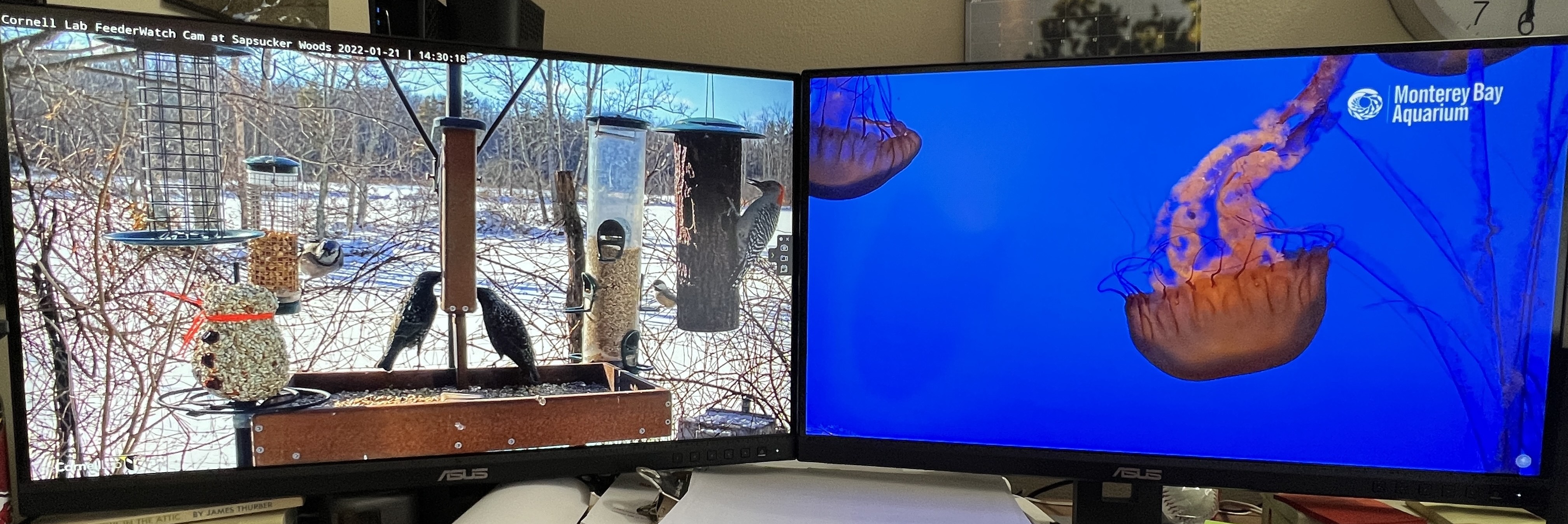 On the left, the Cornell Lab FeederWatch Cam At Sapsucker Woods in Ithica, New York. If you don’t want to watch these birds, Cornell Labs has a whole lineup of other webcams around the world.