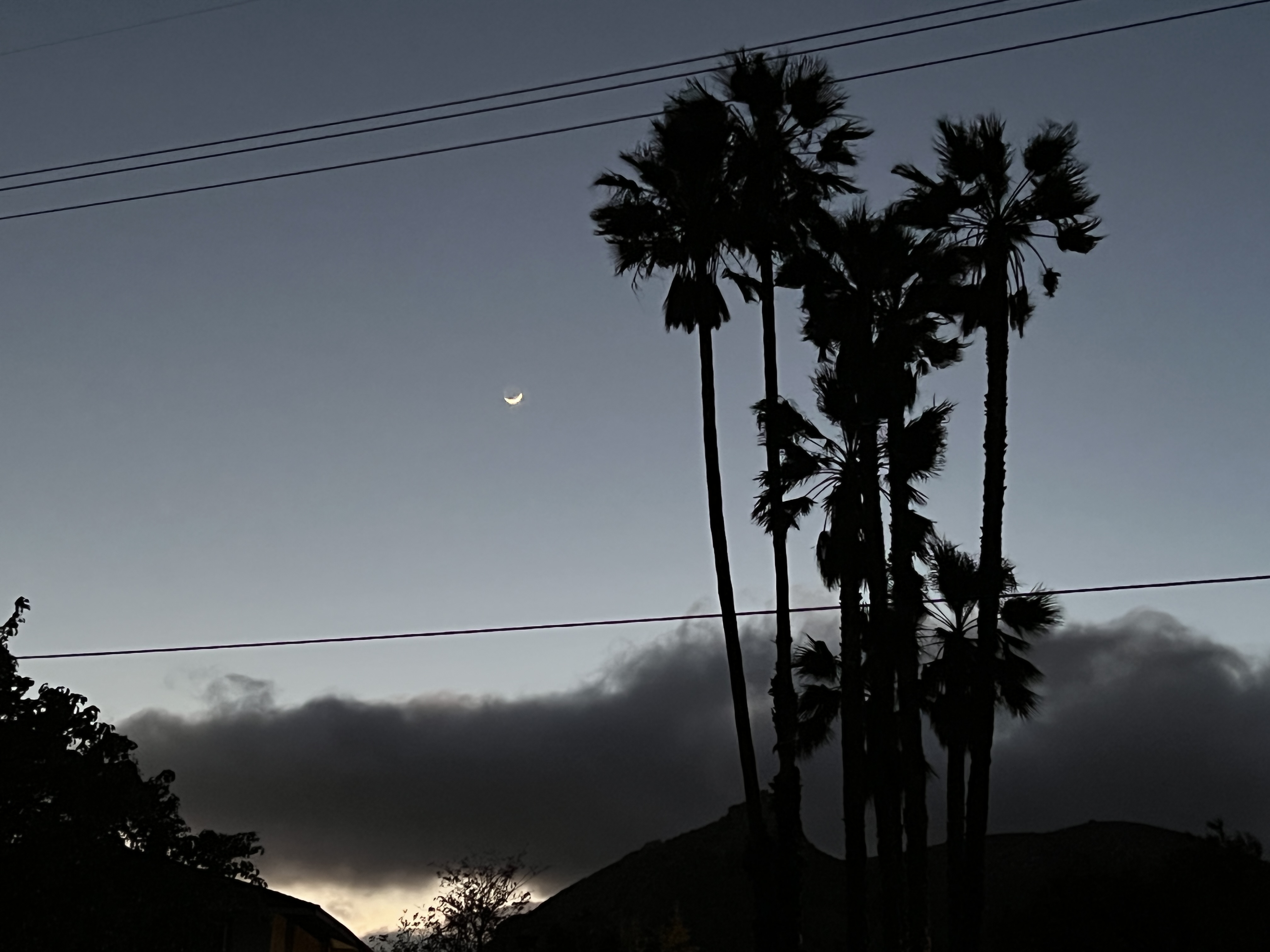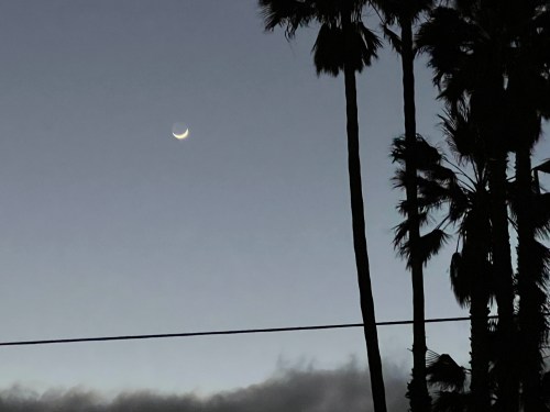 Caught in between, the three-day old moon, 7% illuminated, the other 93% glowing softly in Earthshine.