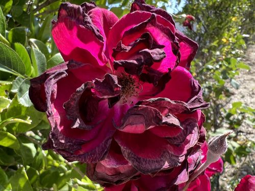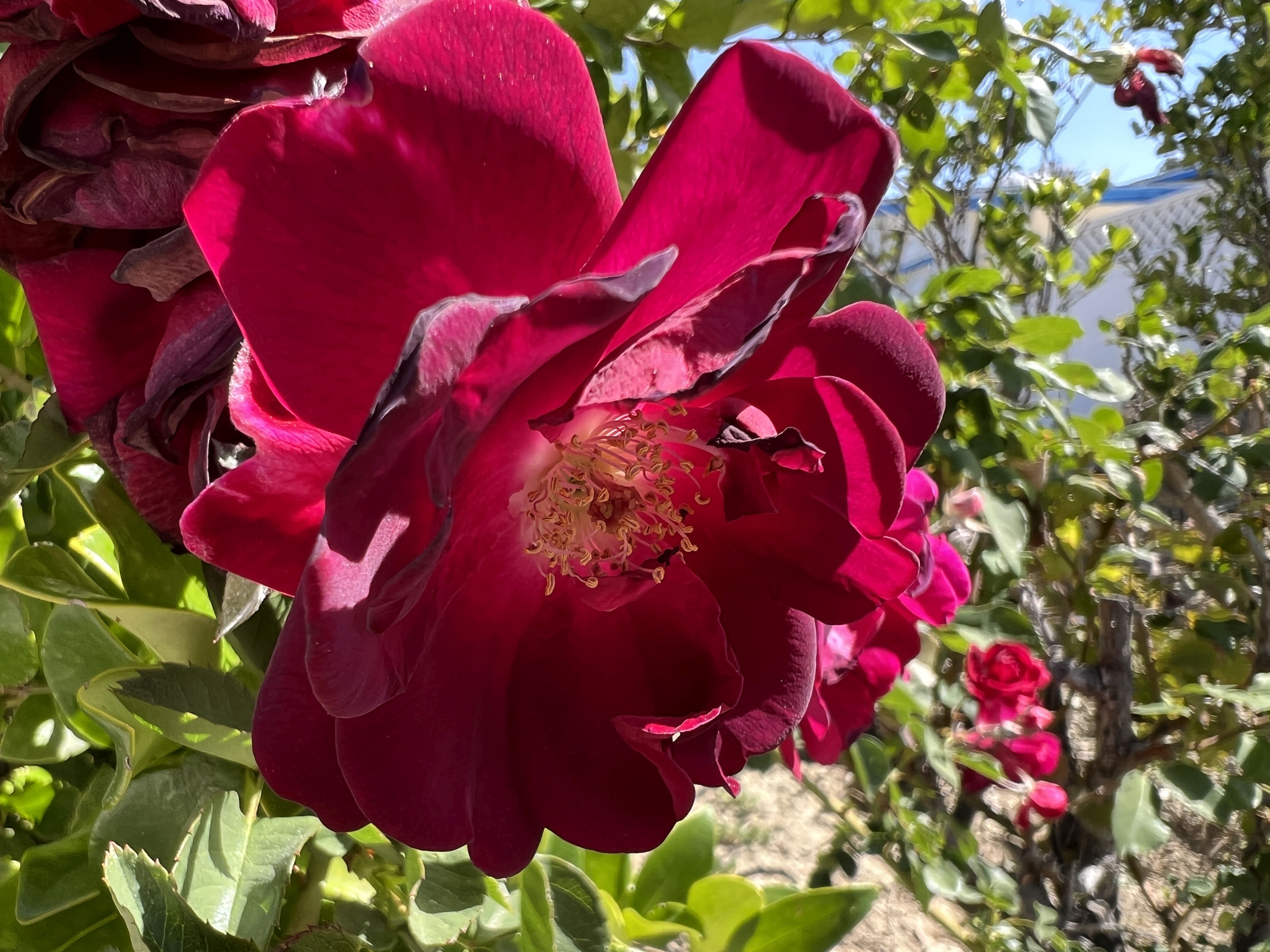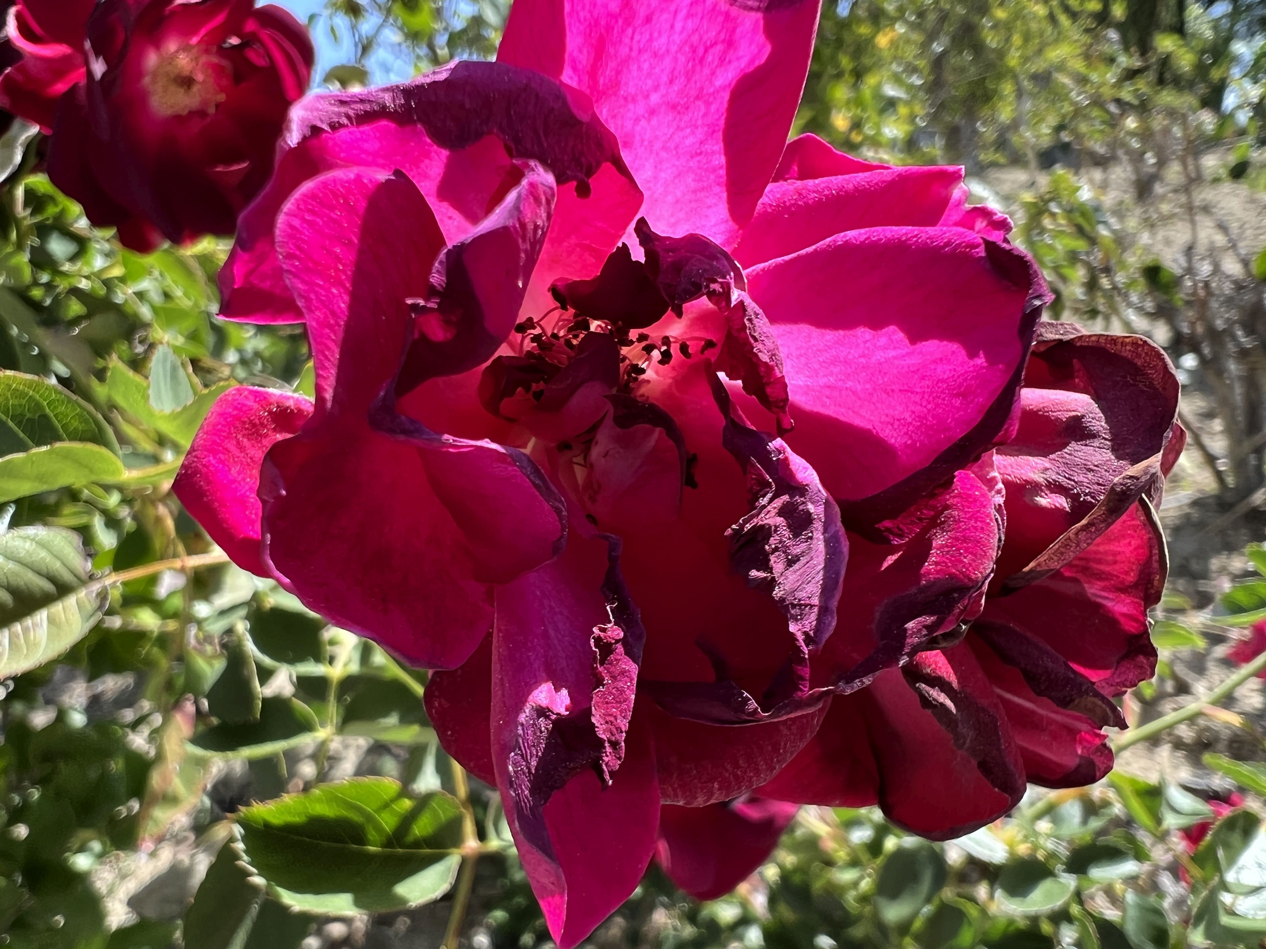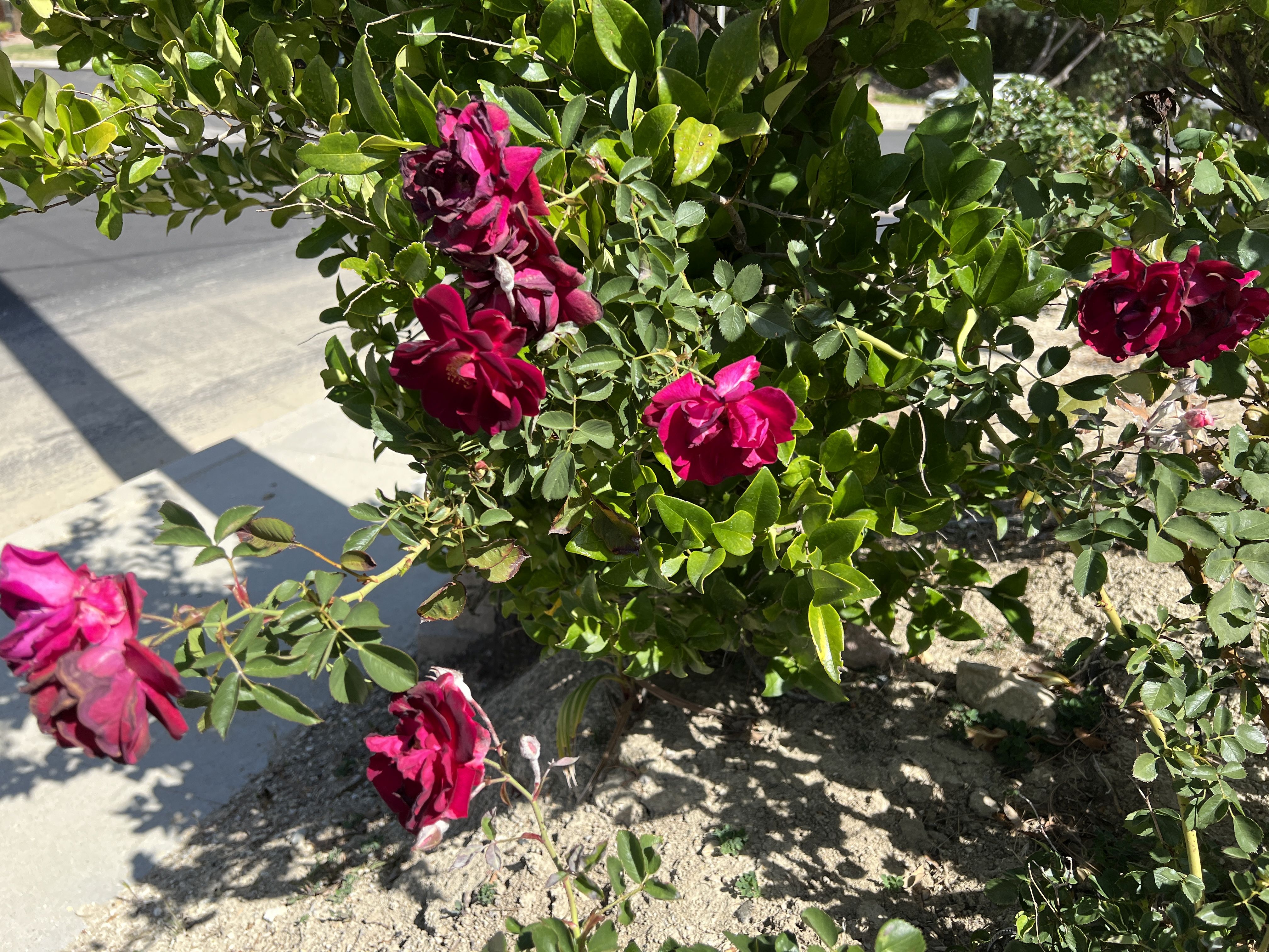 And while the thorns are quite sharp, frequent guests in the stems and leaves are the elusive little wrens that are so loud, so tiny, flittering madly, equally oblivious to the needle-sharp points and the dusky red beauty all around them.