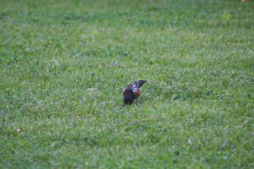 It’s rather distinctive, with the white breast, black head, sides that look like a robin, and the black and white spots on the back and wings.
